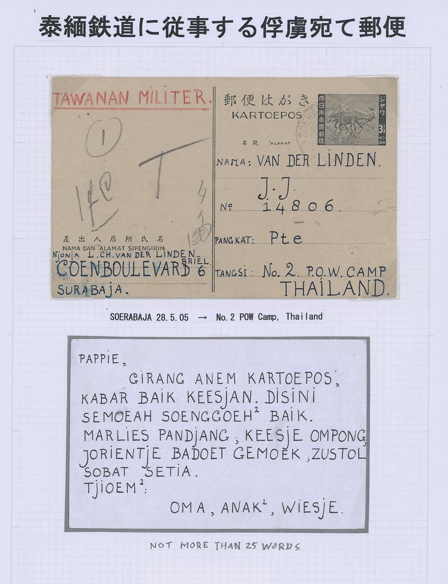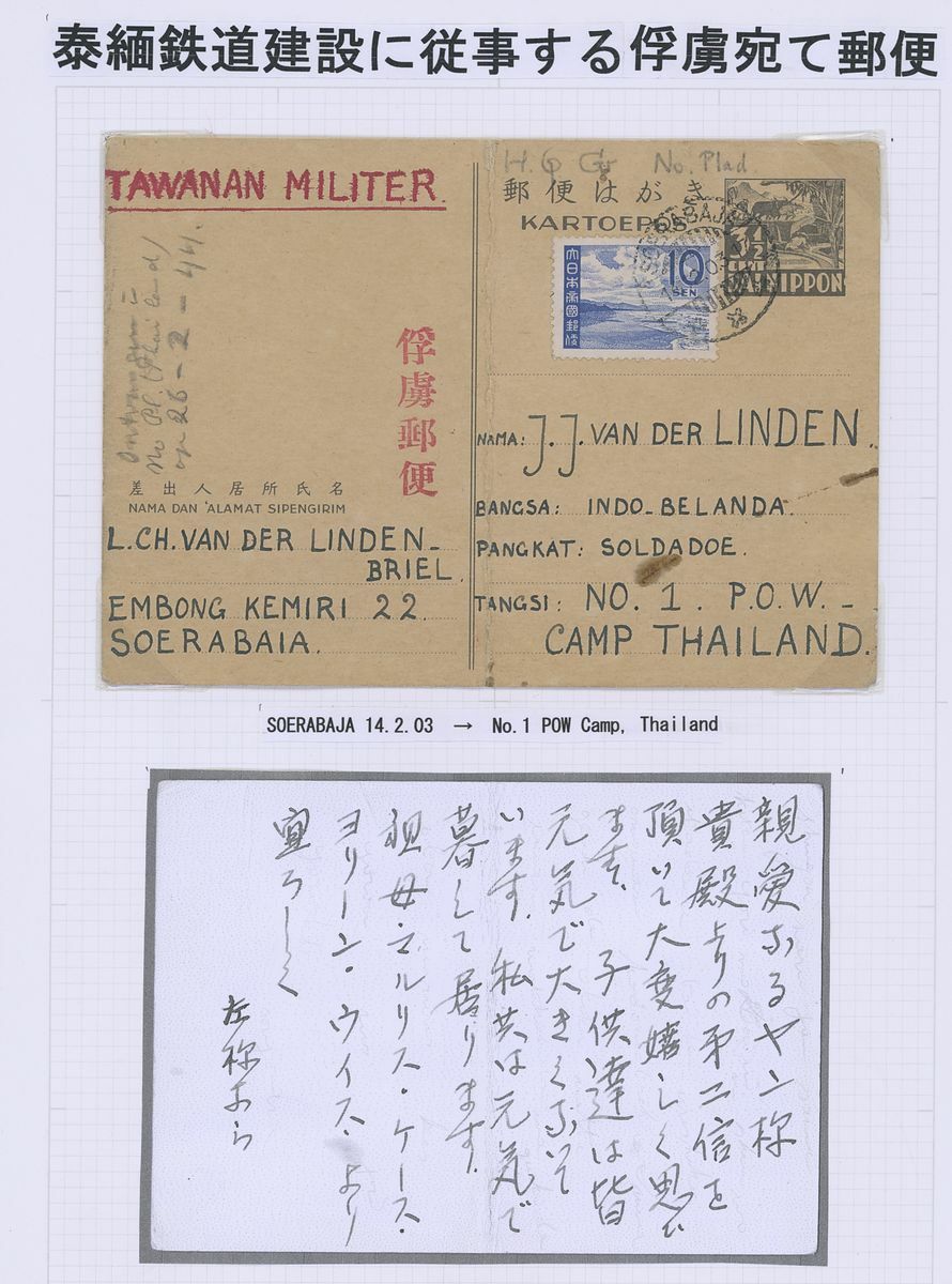 1943 (14 Feb.) Dai Nippon 3½c. stationery card uprated with 10c., and 1945 (28.5) Japan 3½c. stationery card, both from Surabaya to the same Dutch POW at Camp No. 1 and No. 2 respectively, both marked “Tawanan Militer” (Military Prisoner), the former with heavy central vertical crease showing red censor chop. An interesting pair of cards