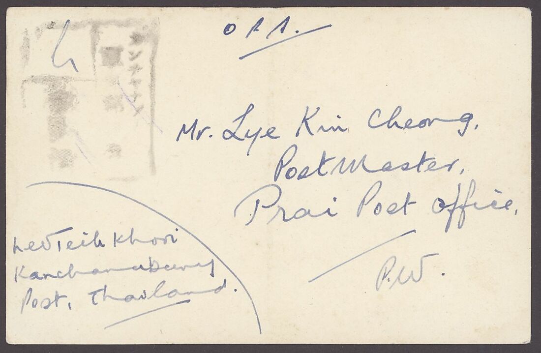 1944 (21 Nov.) unstamped card to Prai, marked "OPA" and showing black censor chop at upper left; the card with pressed central vertical fold. The card with message written on the reverse from Tamajo and talking about Mr. Omar who ...owed money 15 rupee to three of Post Office staff at Tamajo....