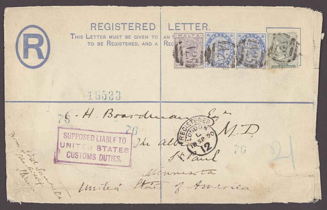 1890 2d. registered envelope size H addressed to the USA uprated with 1885-90 ½d., 2½d. (2) and 1/-, cancelled by 'A25' obliterator, via London (19.9) and the reverse with transit New York (29.9) and arrival St. Pauli (1.10) with day '1' inverted. The front showing scarce