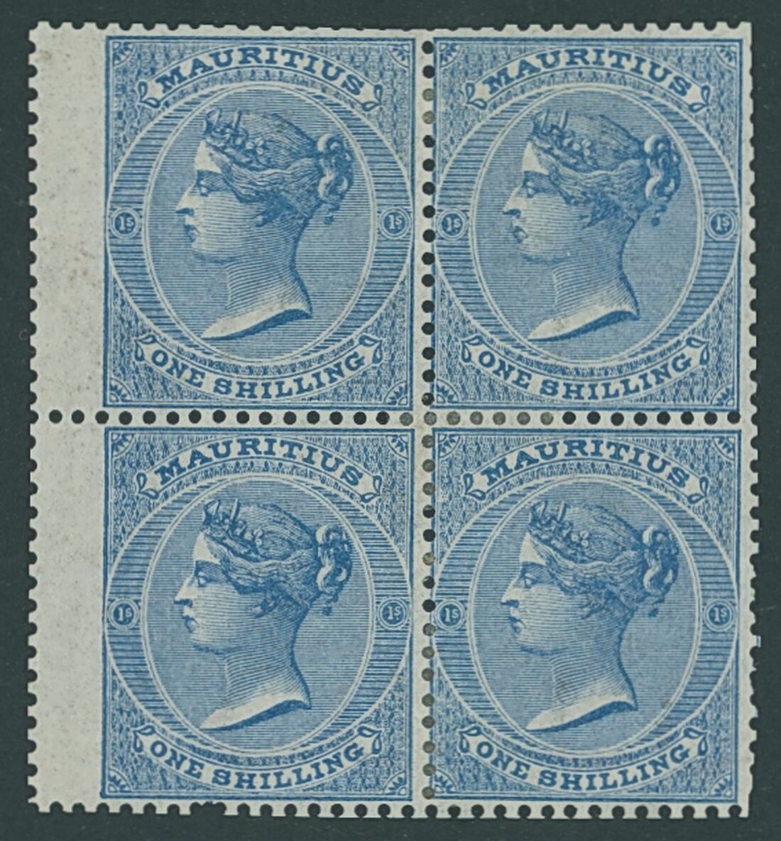 1863-72 1/- blue block of four fresh large part original gum, some perforation faults otherwise fine and with fresh colour. S.G. 69, £600