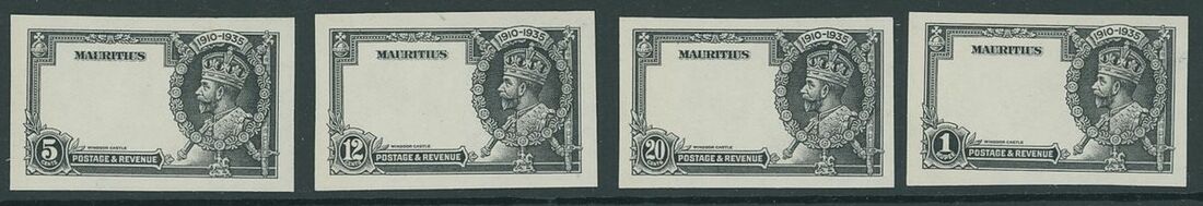 1935 Silver Jubilee 5c., 12c., 20c. and 1r. imperforate proofs of the frame only in black on wove paper. Fine and one of only two complete sets know.
