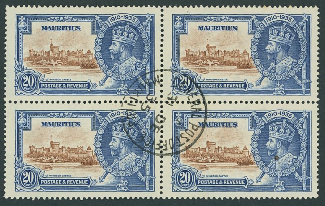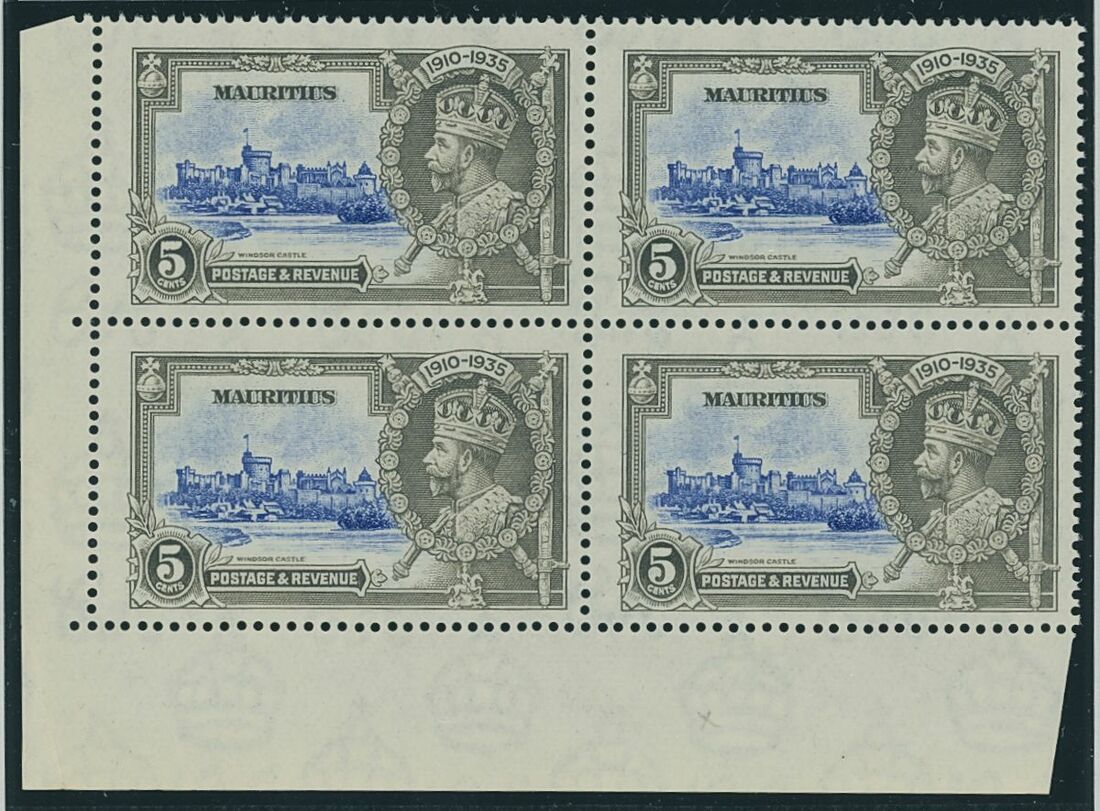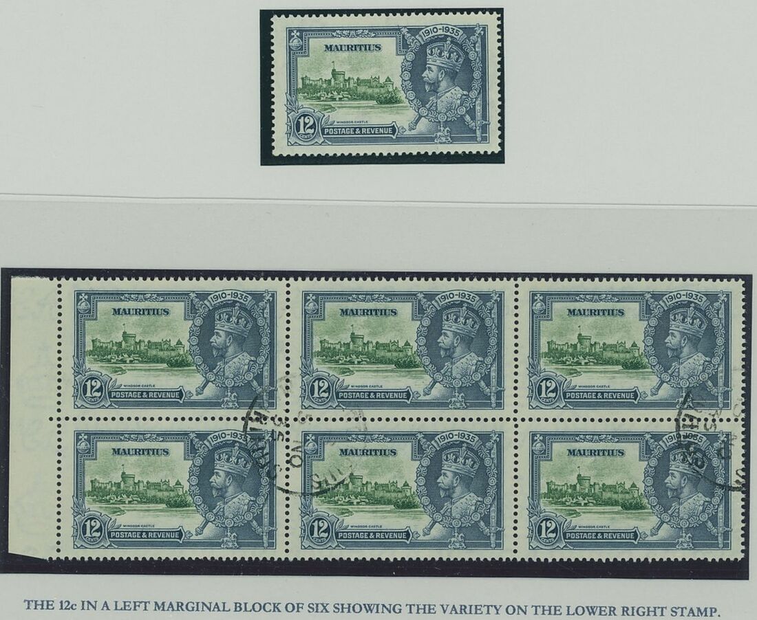 1935 Silver Jubilee variety selection including 5c. diagonal line by turret in positional lower left corner block of four showing both variations of the variety unmounted, 12c. diagonal line by turret mint, 12c. left marginal block of six with lower right stamp showing dot to left of chapel used, 20c. diagonal line by turret in positional block of four with lower pair showing both variations of the variety (lower right stamp with ink spot). Generally fine. S.G. 245, 245f, 246, 246f, 246g, 247, 247f, £550