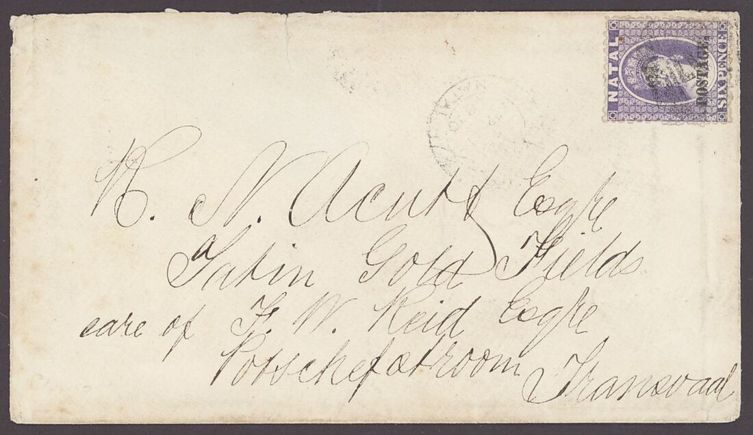 1870 (20 Sept.) envelope addressed to "R.N. Acutt, Tatin Goldfields, care of F.W. Reid, Potchefstroom", bearing 1869 6d. violet overprinted