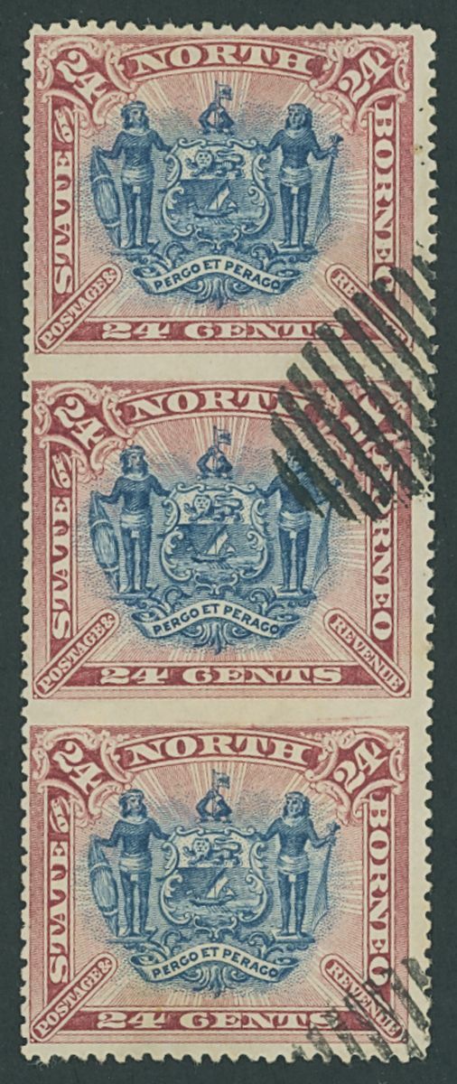 1894 (Feb.) Pictorial 24c. blue and rose-lake vertical strip of three, variety imperforate between, cancelled to order as usual, fine and scarce. S.G. 79b, £650.