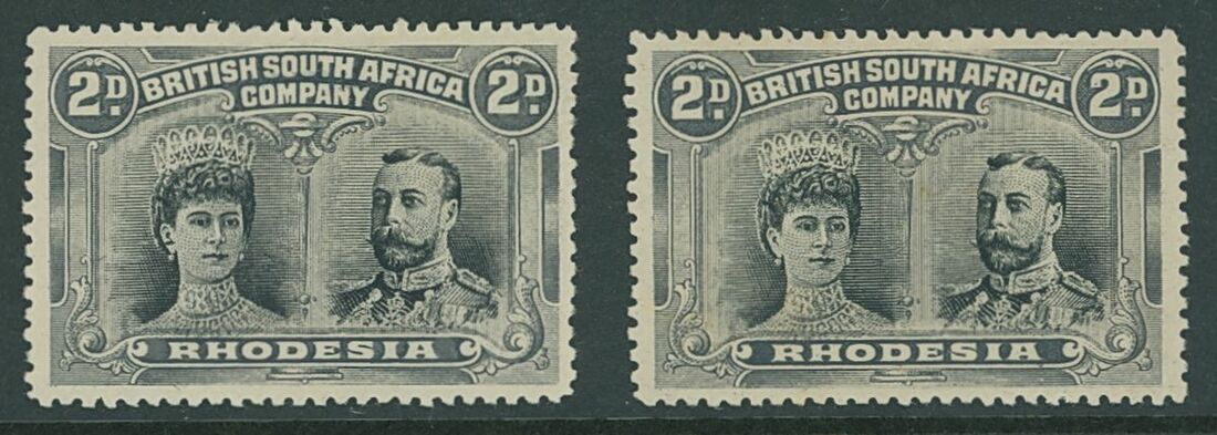 2d. black and slate-grey, long gash headplate, two examples comprising [2] showing long gash in Queen's ear and [46] showing King's extra curl; large part original gum. S.G. 128
