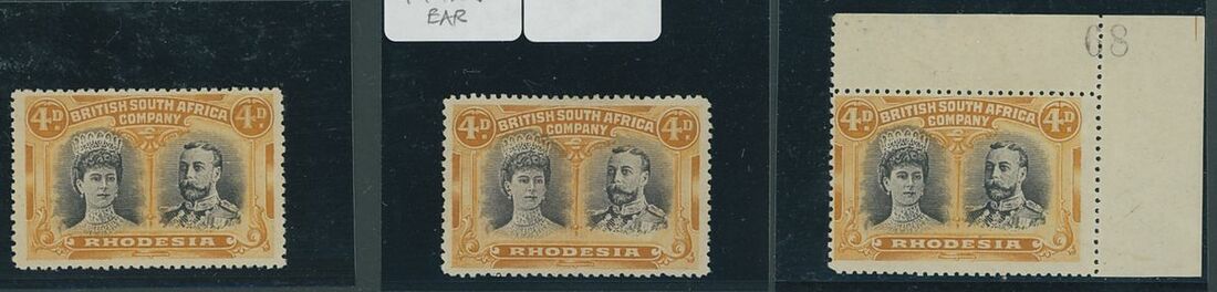 4d. brown-purple and orange (3) comprising [2] showing long gash in Queen's ear, [5] from the upper right corner of the sheet with sheet number '68' and [6]; fine mint. S.G. 139