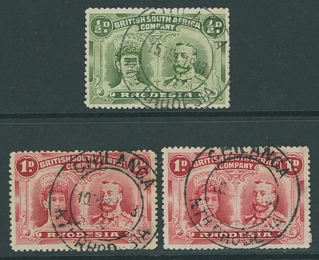 Chilanga: 1913 a group with (15 Dec.) in blue-black on ½d., C4 (extremely rare); (10 Feb.) in blue-black viscous ink and defective date, particularly month and year on 1d. (2), central strikes, C7 (both of the recorded examples). (3)