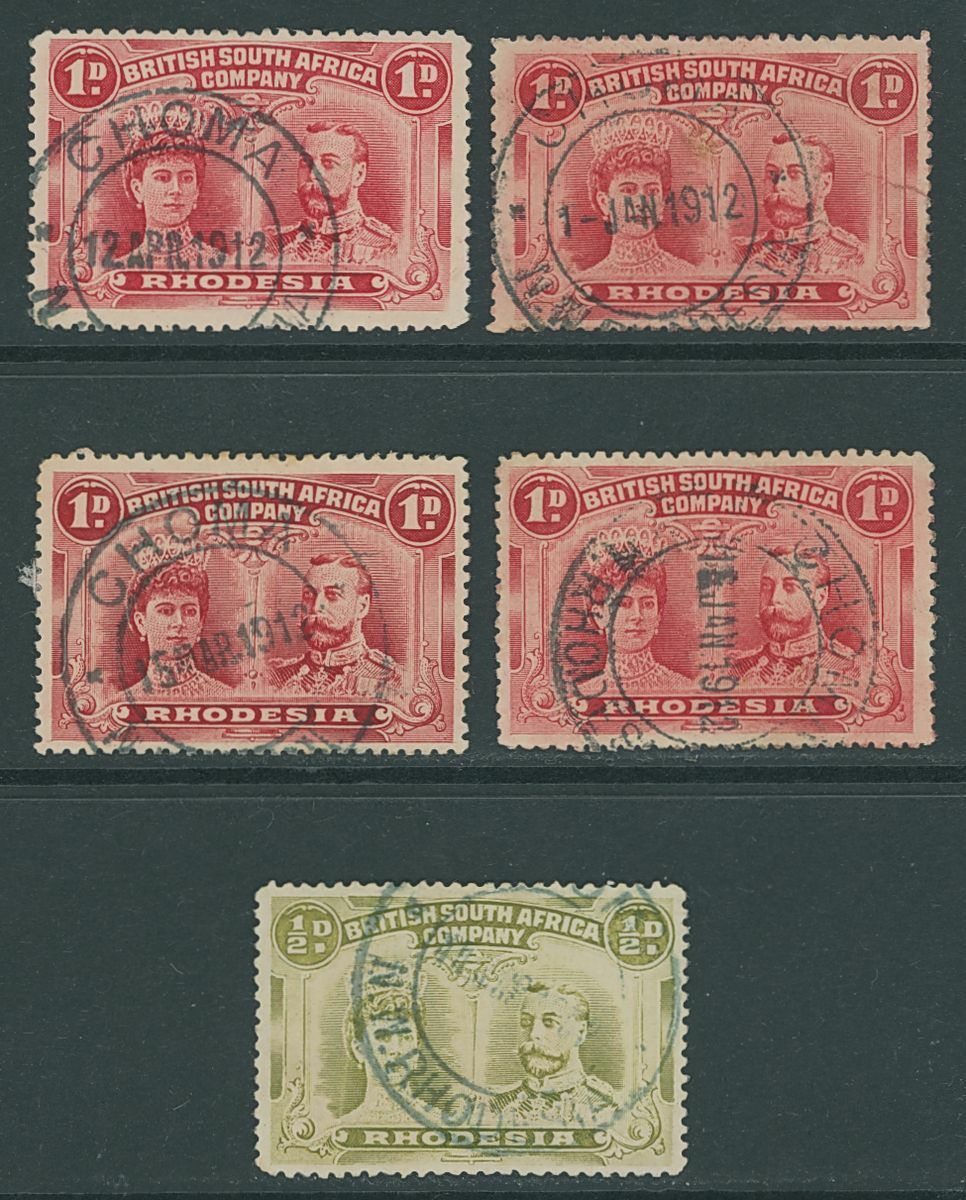 Choma: 1912 a group of blue postmarks on 1d. with (12 Apr.) in blue (C24 (rare); (1 Jan.) in blue, both legs of "A" broken, C25 (extremely rare); (15 Mar.) broken "M" in month, C26 (extremely rare); (1 Jan.) blank after day and both legs of "A" broken, C27 (unique); (11 Jan.) in turquoise on ½d. C31 (extremely rare). (5)