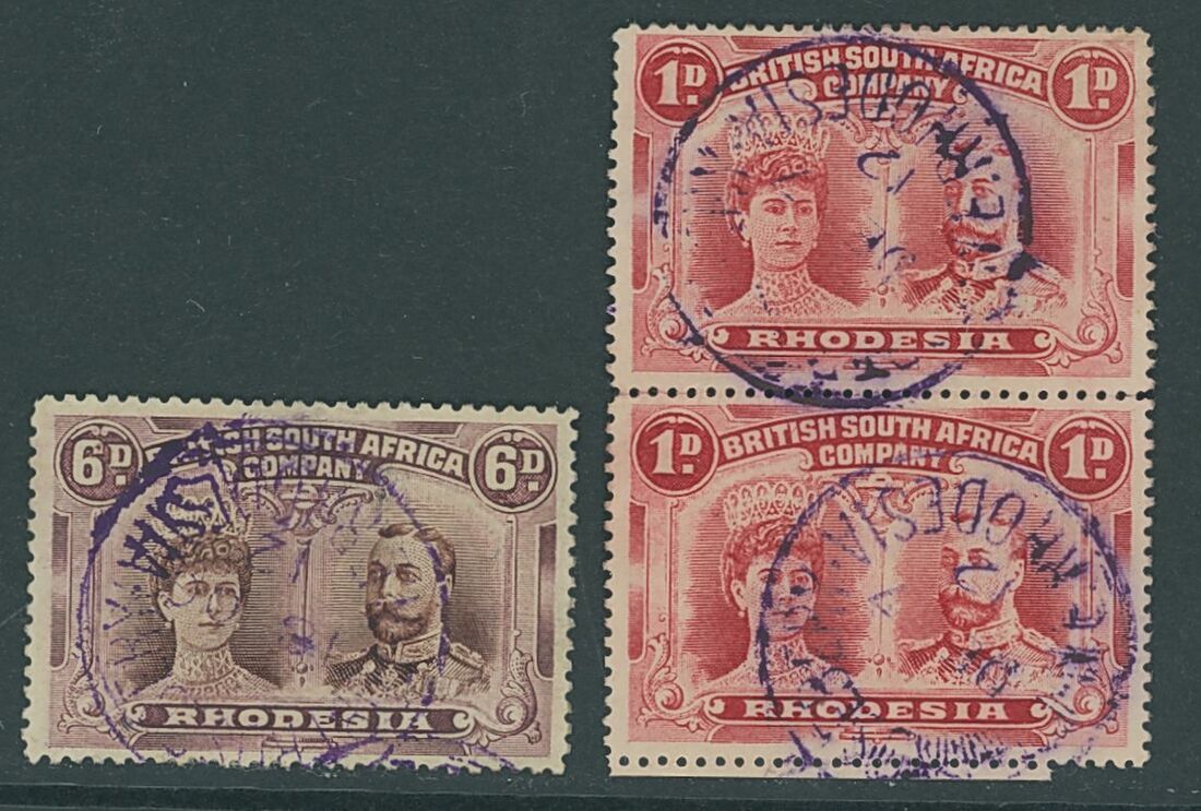Fort Rosebery: violet ink with 1912 (18 Oct.) day month on 6d. brown and purple, F23 (2 recorded); 1912 (7 Dec.) month day, fine strikes on vertical pair of 1d. perf.15, F27 (rare). (3)