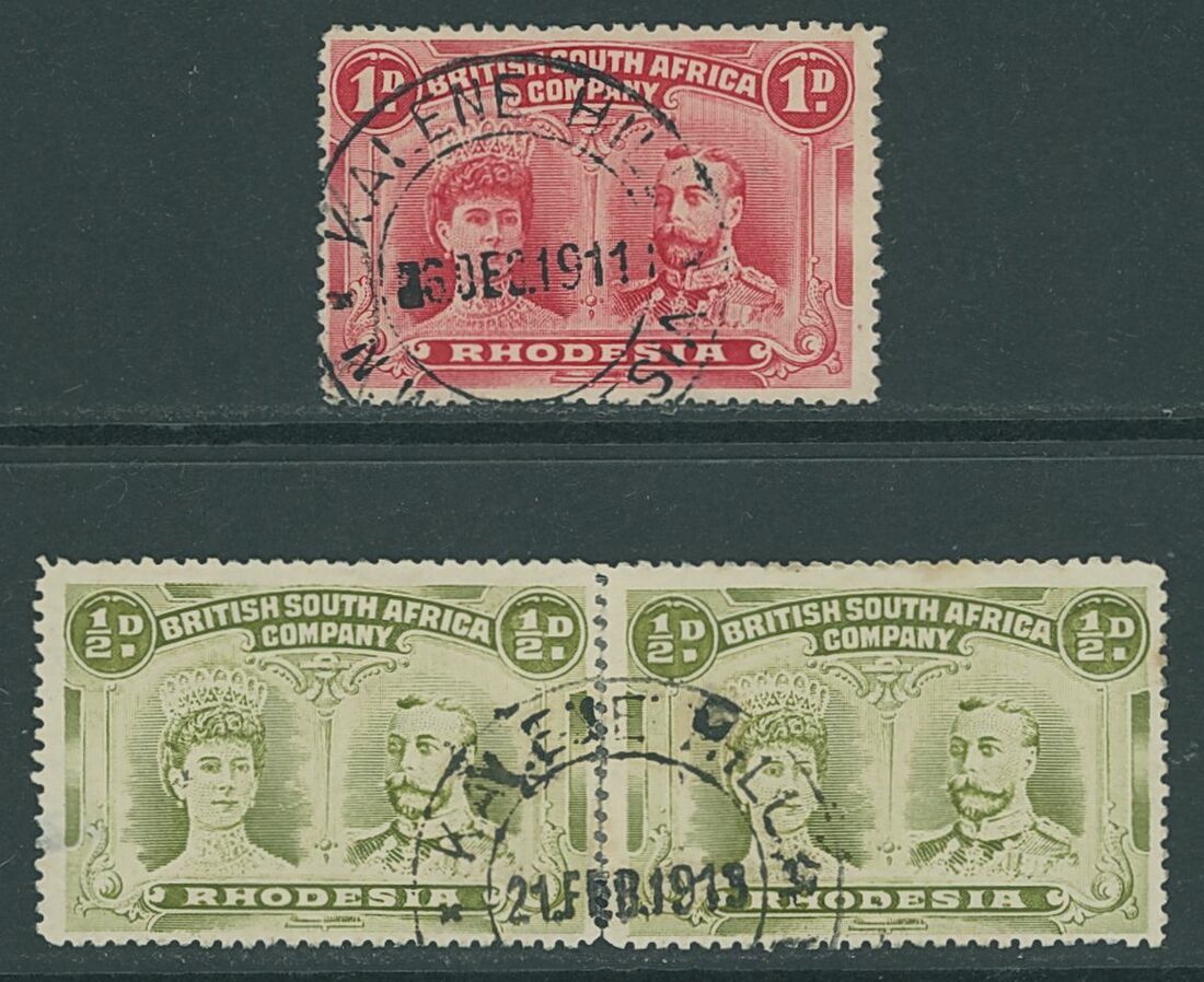 Kalene Hill: 1911-13 with 1911 (6 Dec.) in jet-black viscous ink showing blank before day, a fine strike on 1d., K6A (unique); 1913 (21 Feb.) in a brownish, liquid ink on a rejoined horizontal pair of ½d., clearly showing the date; small thin at left, K7 (2 recorded). (3)