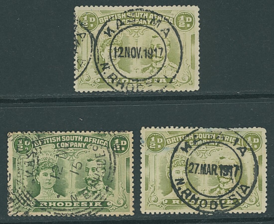 Kasama: 1915-17 a small group on ½d. with 1915 (12 Nov.) squared circle with day month, K19 (unique); 1917 (12 Nov.) showing four figure year, K24 (very rare) and 1917 (27 Mar.) in jet-black viscous ink (small thin at top), K25 (extremely rare); both neat and central strikes. (3)