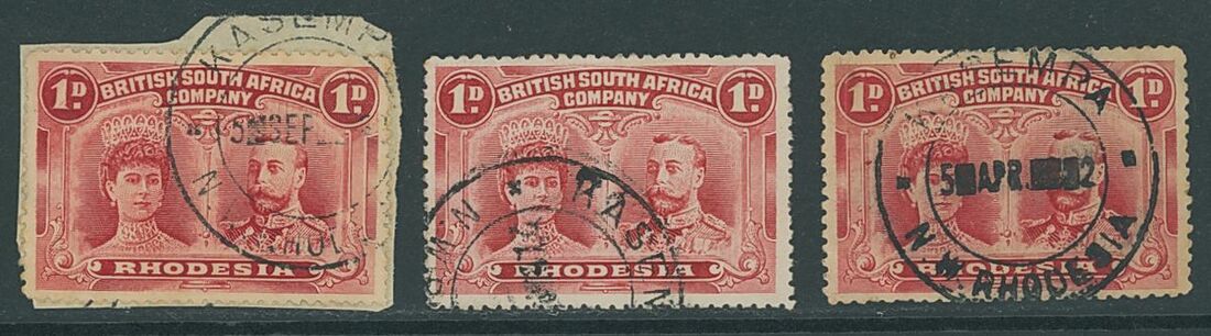 Kasempa: a group of postmarks on 1d. with 1912 (5 Sept.) showing blank after day, large blank and single blank before "2" in year, on small piece, K28 (extremely rare); (27 Sept.) in jet-black viscous ink, a part strike on perf.15, K29 (extremely rare); 1912 (5 Apr.) in jet-black viscous ink showing blank after day, large blank and single blank before "2" in year; corner crease, K30 (unique). (3)