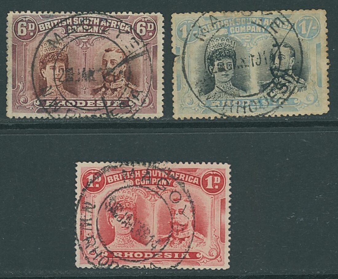 Magoye: 1914, a valuable group with (2 Jan.) blank after day on 6d. red-brown and mauve and on 1/- black and pale blue-green (fault at left and soiled), M2 (both of the 2 examples recorded); (9 Jan.) in jet-black viscous ink, blank after day on 1d., fine. M5 (unique). (3)