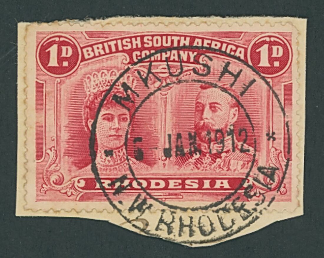 Mkushi: 1912 (6 Jan.) a complete strike in jet-black viscous ink on 1d. on small piece; fine. M10 (very rare)