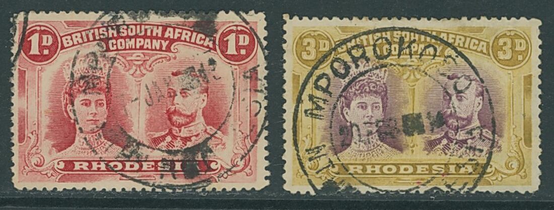 Mporokoso: blank before two figure year in jet-black viscous ink with 1913 (7 Jan.) on 1d. and 1914 (20 Feb.) on 3d. purple and yellow-ochre, fine. M23 (very rare). (2)