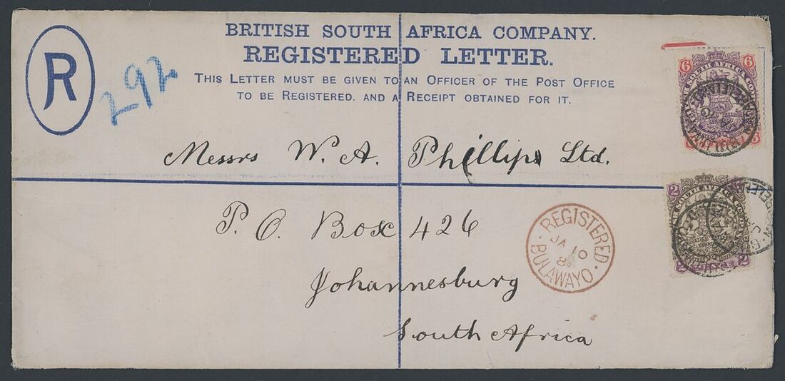 Bulawayo: 1898 (10 Jan.) 4d. registered envelope to Johannesburg, uprated with 1896-97 2d. and 6d. tied by neat c.d.s. variety yeardate omitted, alongside is a fine strike of the single-circle "