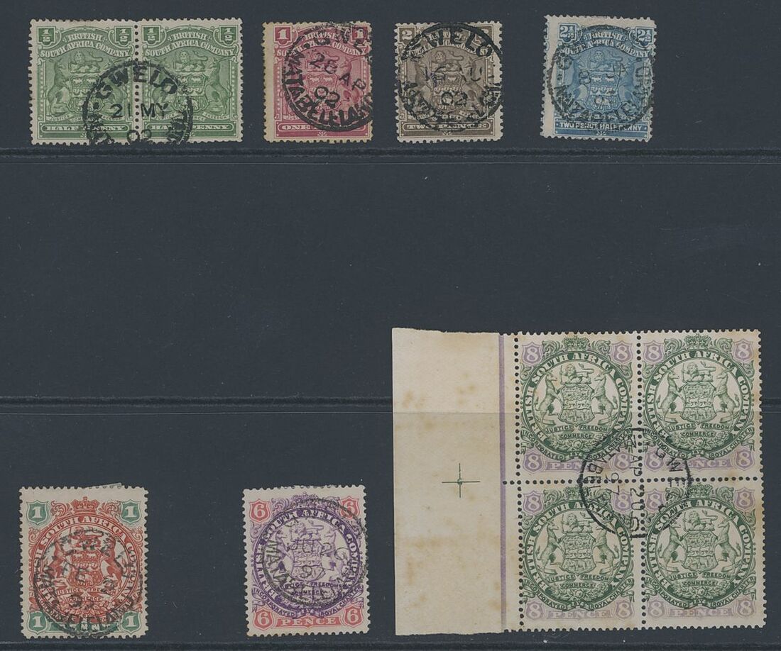 Gwelo: a group with 1897 c.d.s. on 1896-97 1d., 6d. and 8d. in a left margin block of four (age marks); 1902-03 strikes on 1898-1908 ½d. pair, 1d., 2d. and 2½d.; generally good to fine. (10)