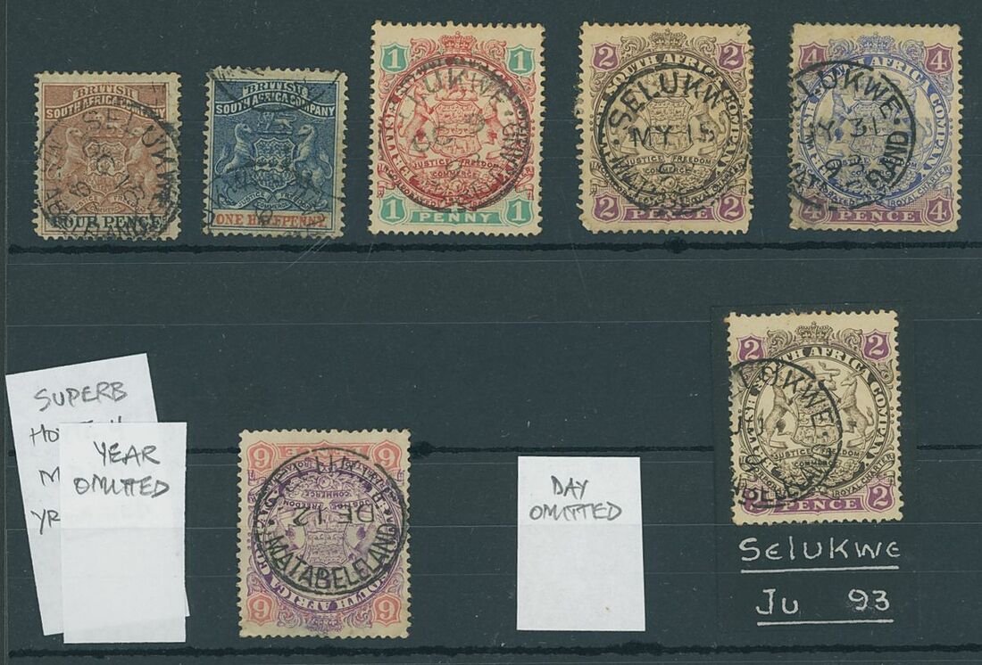 Selukwe: a good group of these scarce postmarks with 1892-97 values to 4d., plus 2d. with day omitted and 6d. with year omitted and month day inverted; most appear to have the incorrect year as "93"; a few age marks but good strikes. (7)