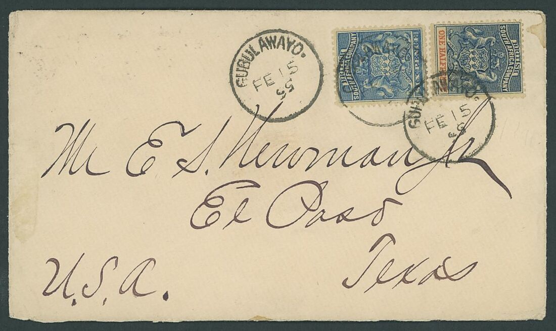 Gubulawayo: 1895 (15 Feb.) envelope to U.S.A. bearing Small Arms ½d. and 6d. tied by Gubulawayo c.d.s. with Bechuanaland removed and showing "5" in year inverted, the reverse with Cape Town, New York (23.3) and El Paso arrival (28.3) datestamps. A fine cover