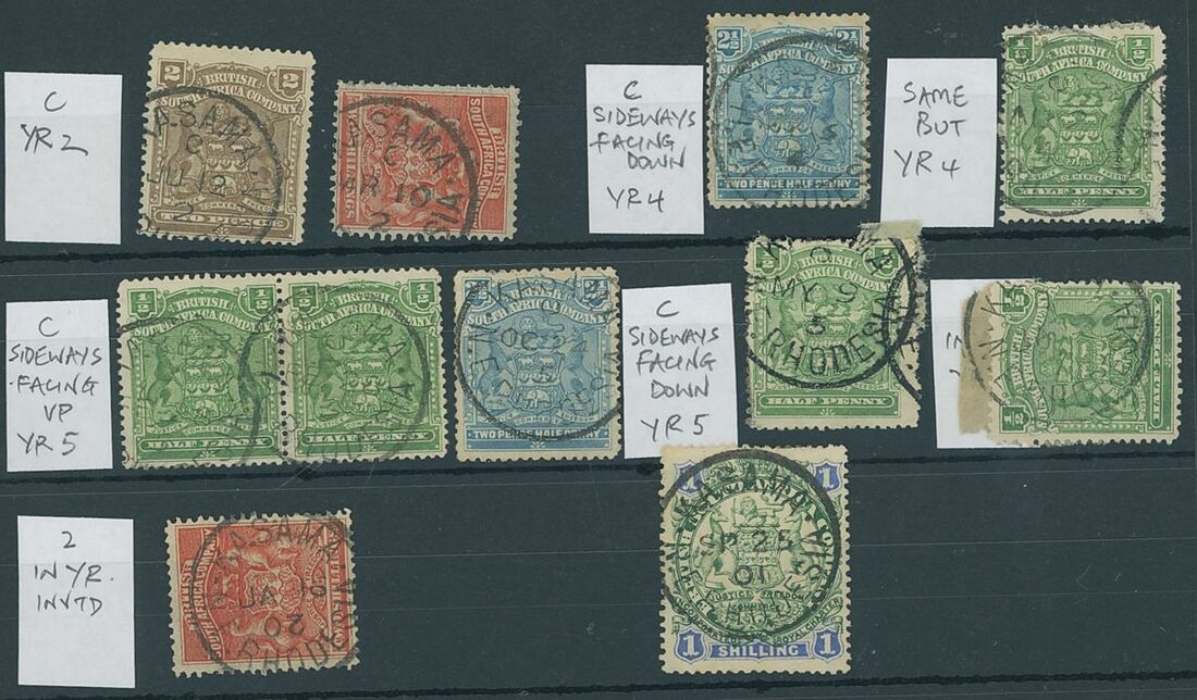 Kasama: 1901-07, single-circle group with 1901 on 1/-, "2" for year (2), "4" for year (2), "4" of year (3), "5" for year and "7" for year, also 1902 with "2" inverted and no code; these strikes show the code "C" in various orientations. (11)