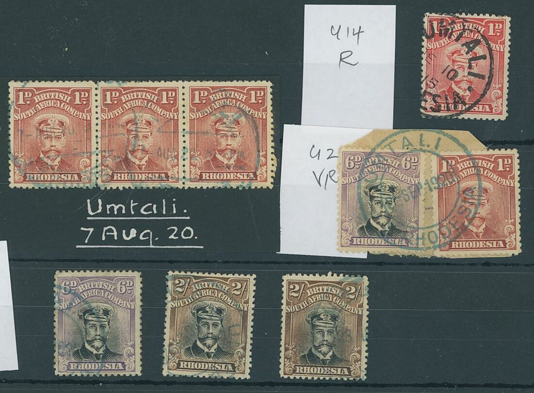Umtali: 1915-20 a group of postmarks with 1915 (10 Dec.) a fine strike of the single-circle on 1d. U14 (rare); 1920 (7 Aug.) large DCAJ strikes in pale turquoise on strip of three 1d., U21 (rare); 1920 (2 Sept.) a complete strike of the double-circle in blue on 1d. and 6d. on piece, U29 (very rare); double-circle in pale turquoise on 6d. and 2/- (2), U30 (very rare). A good group. (9)