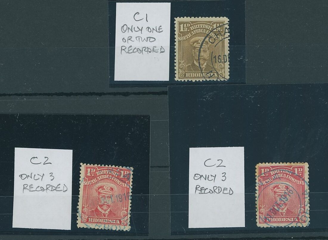 Chansa: 1916 (11 Oct.) double-circle in blue on 1d., two examples (one with light tone spots), C2 (3 recorded); also a part strike in black on 1½d., C1 (2 recorded). (3)