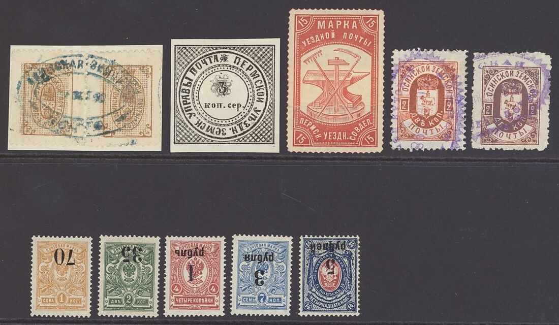 Area selection including Siberia Kolchak Army issues 1919 perforated stamps selection (5) each showing variety overprint inverted , fine mint or unmounted and expertised by Mikulski or with other Soviet Philatelic markings on the reverse. Zemstvo Osa 1890 4k. brown and pale brown with background shifted to left, horizontal pair on small piece cancelled by complete oval c.d.s. in blue. 1898 2k. red (2) used. Perm 1872 3k. black, variety broken inner circle unused. 1918 15k. red printed on pasted up paper unmounted. Slightly mixed condition, a useful selection for the specialist.