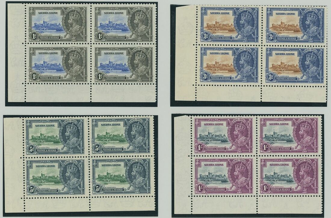 1935 1d. to 1/- in lower left corner blocks of four, each with the upper left stamp showing variety extra flagstaff, fine mint, a scarce set. S.G. 181-184, 181a-184a, £960.