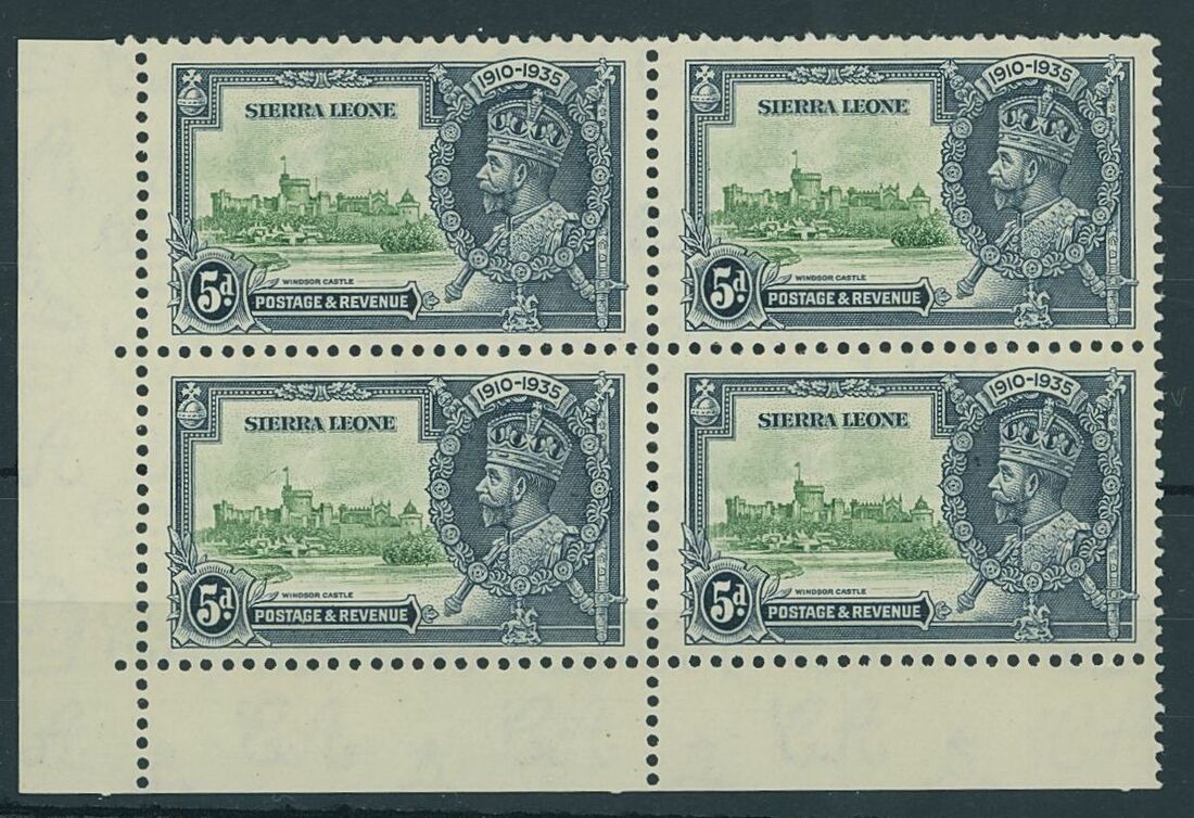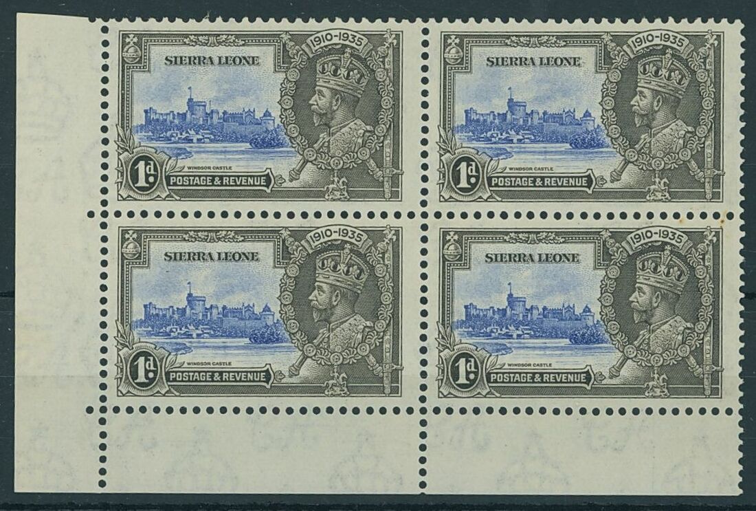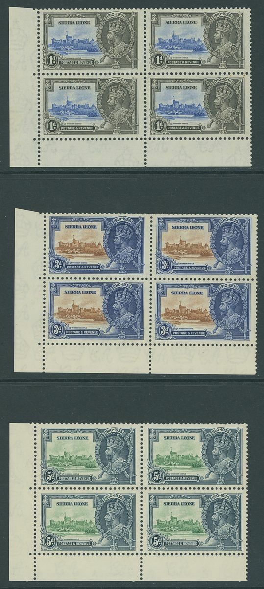 1935 1d. to 5d. in lower left corner blocks of four, each with the upper left stamp showing variety extra flagstaff, unmounted mint, generally fine. S.G. 181-183, 181a, 182a, 183a, £400+.