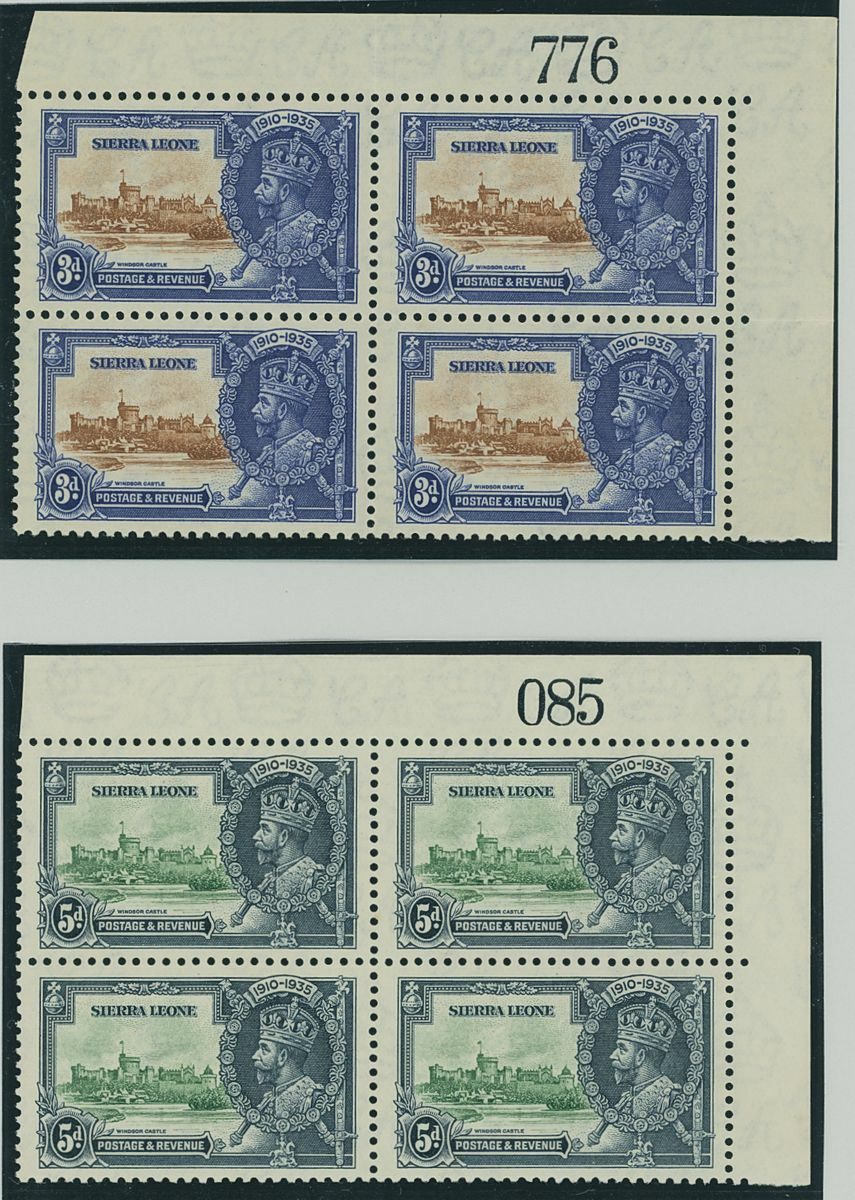 1935 3d. and 5d. in upper right corner blocks of four with sheet numbers in margin, each with the lower left stamp showing variety lightning conductor, unmounted mint, the 5d. block mounted on the margin only, the 3d. block previously folded vertically and horizontally across the perforations otherwise generally fine. S.G. 182, 182c, 183, 183c, £400+
