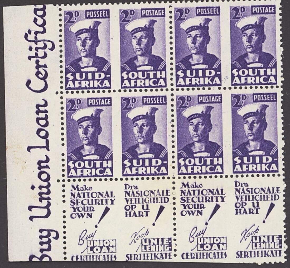 1942-44 War Effort 2d. violet variety roulettes omitted in a corner block of four pairs, mounted in the margin and one stamp; light gum bend affects the corner stamp and the foot of the sheet margin slightly trimmed otherwise fine and rare positional piece. S.G. 100b,