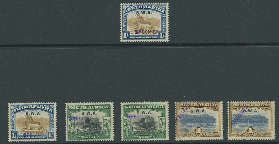 1927-30 1/-, 5/- and 10/- each both types and handstamped specimen in violet, mint/unused, mixed condition. S.G. 64s, 66s, 67s