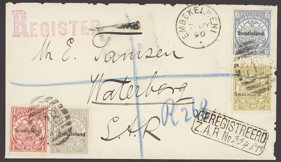 1890 (7 July) envelope ex the Tamsen correspondence registered from Embelekwini to Waterberg bearing 1889-90 ½d., 1d., 2d. and 6d. tied by barred numeral '718' with Embelekwini d.s. and "