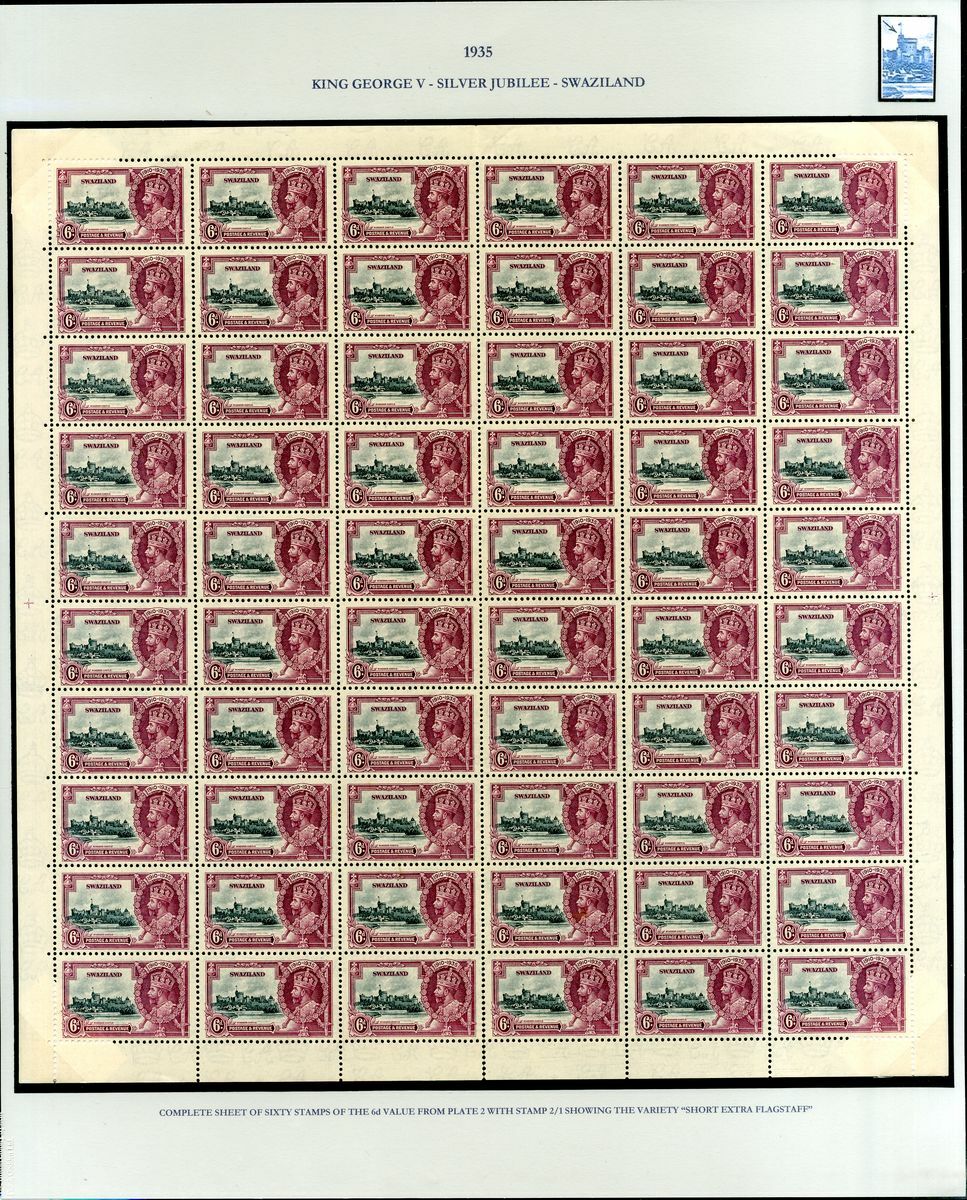 1935 Silver Jubilee 1d. and 6d. complete sheets of sixty, the 1d. sheet from plate six containing variety double flagstaff, the 6d. from plate two containing variety short extra flagstaff, mint and with nearly all unmounted. S.G. 21, 21e, 24, 24b, £690++
