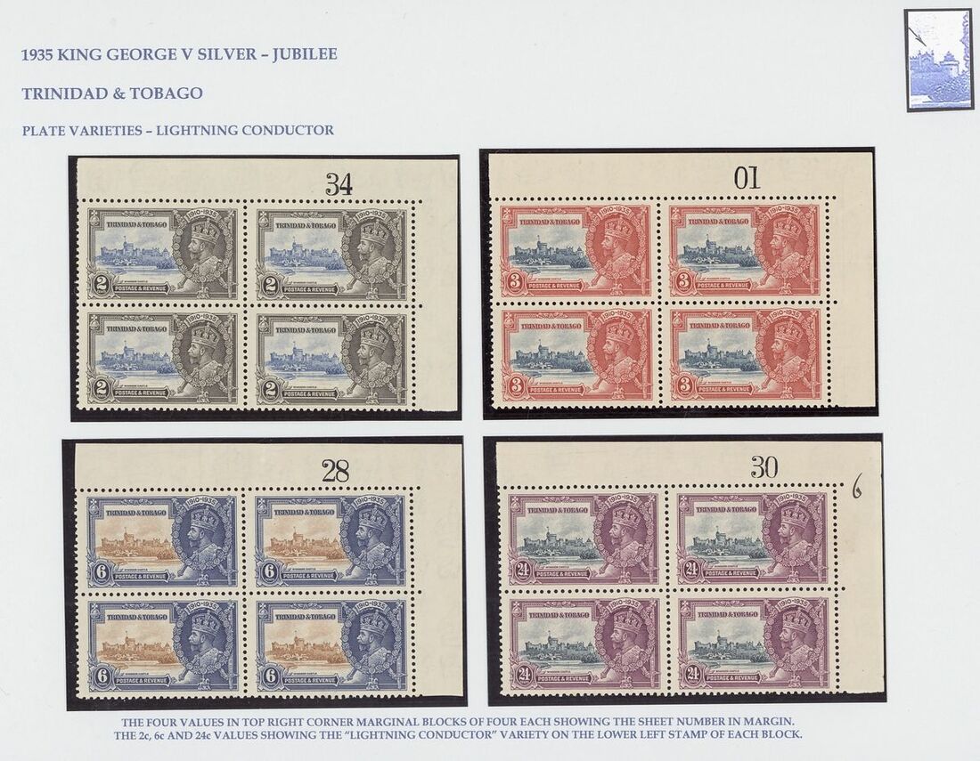 1935 Silver Jubilee 2c. to 24c. in upper right corner blocks of four each with sheet number, 2c., 6c. and 24c. with the lower left stamp showing variety lightning conductor unmounted mint with evenly toned gum, fine. S.G. 239-242, 239c, 241c, 242c, £440+