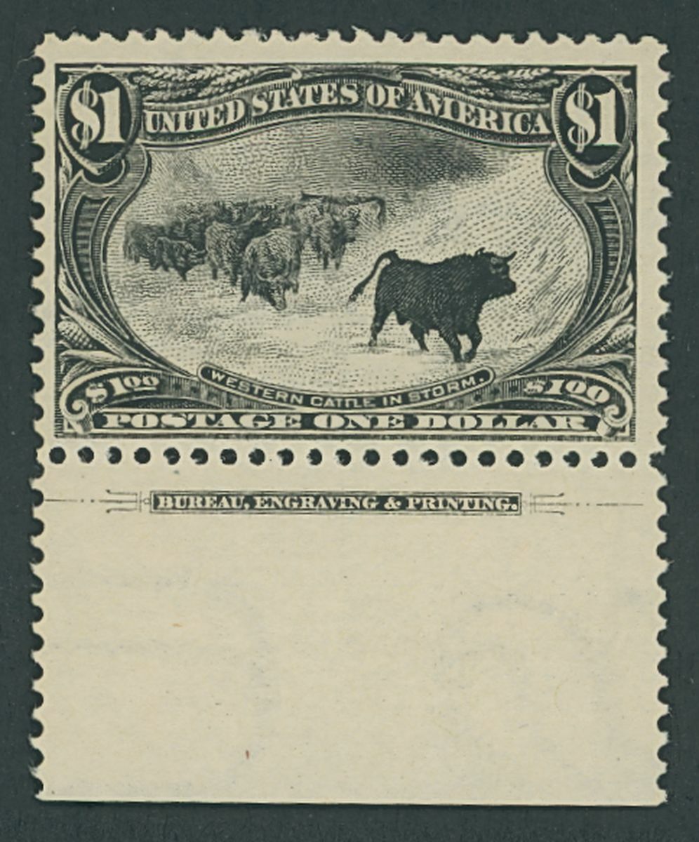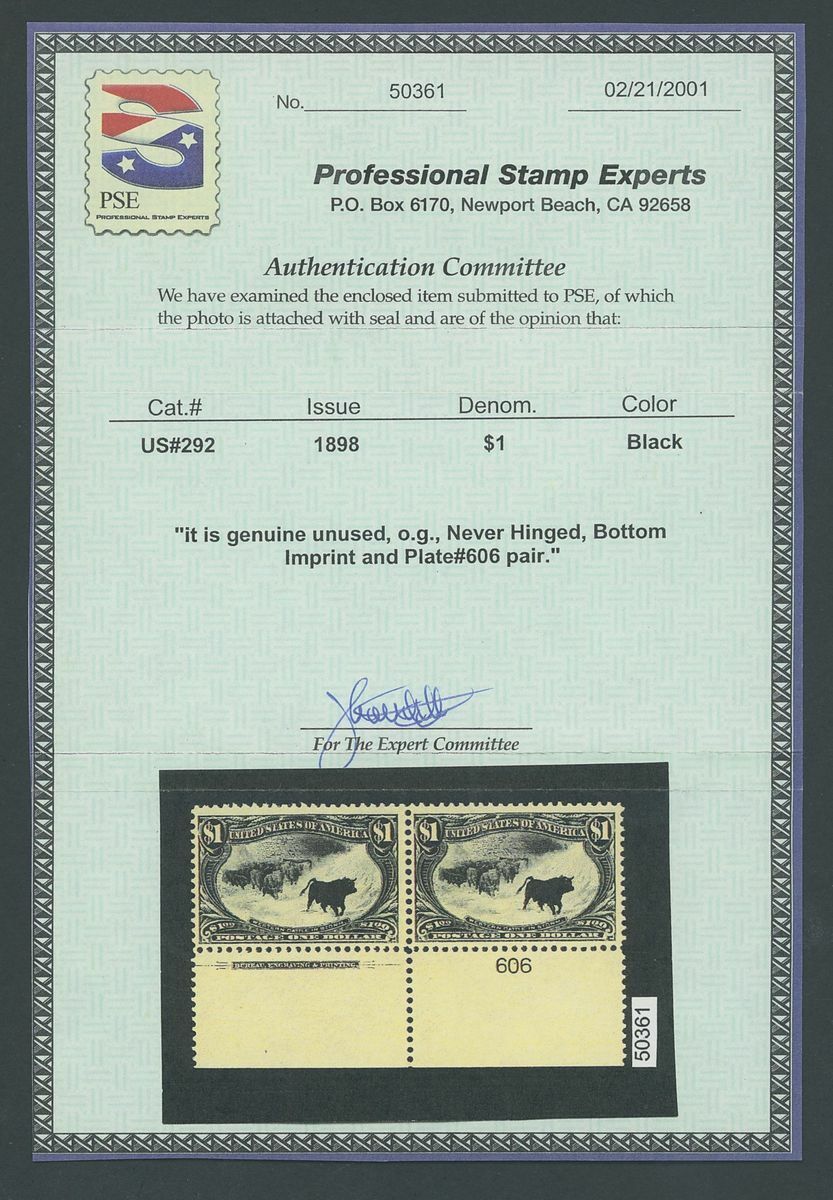 1898 Trans-Mississippi $1 black, lower imprint margin, fresh unmounted mint, very fine. PSE certificate (2001) when was still a pair. Scott 292