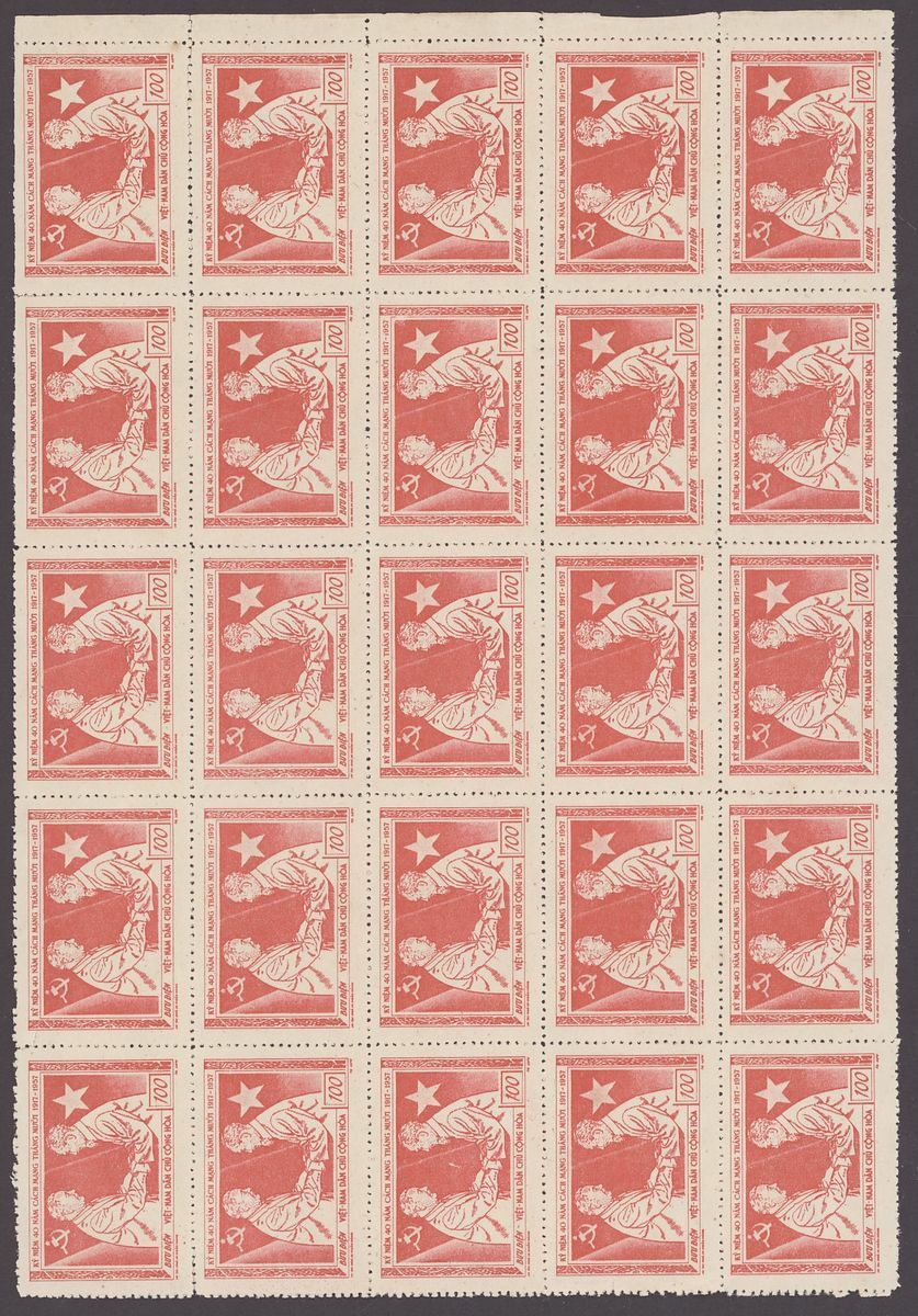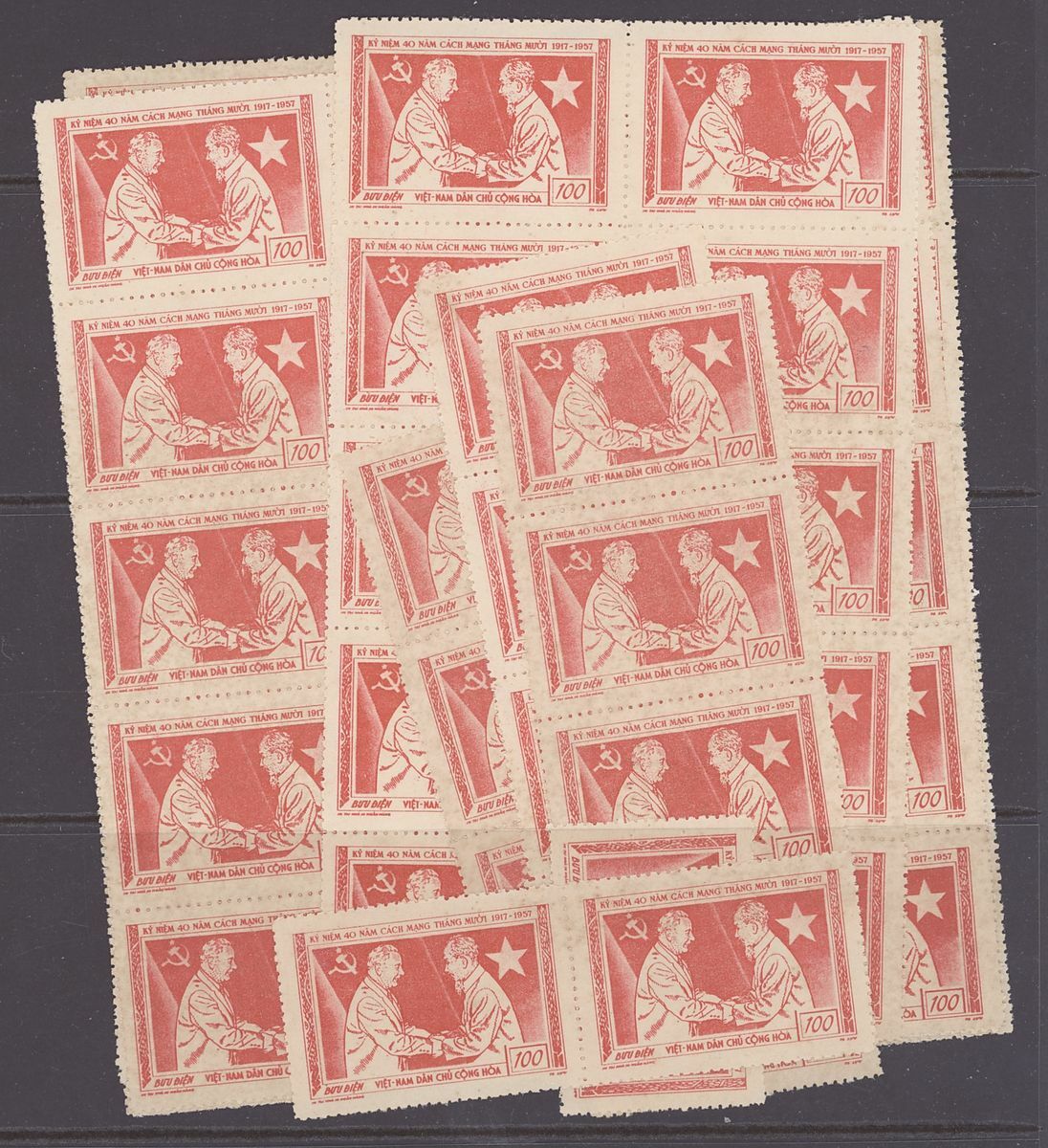 North Vietnam 1954 100d. red full sheet of eighty-one, 1954 50d. red and brown block of seventy one, 1955 Return of the Government to Hanoi 1500d. two blocks of twenty five, 2000d. full sheet of fifty, 3000d. two blocks of twenty five, 1957 40th anniv. of Russian revolution 100d. (109). Slightly mixed condition, S.G. N13, N14, N43, N44, N45, N72, £22,000++