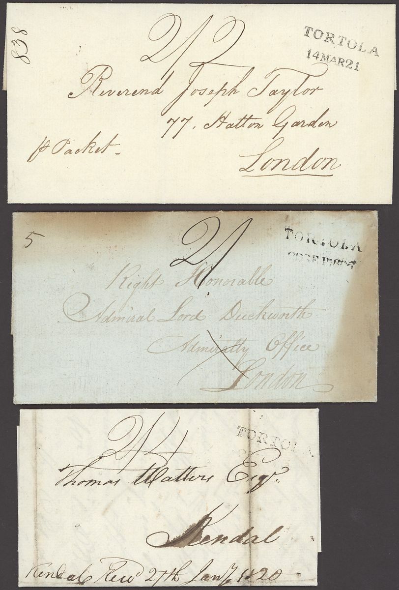 1806 (6 Sept.) entire letter from Saint Thomas to Lord Admiral Duckworth in London, charged "2/" and handstamped "