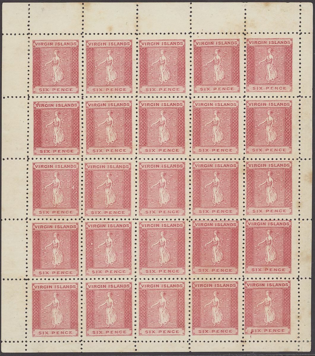 6d. rose complete sheet of twenty-five, R2/1 with variety large 'V', mostly unmounted mint with just a few mounts in the margins, some minor toning otherwise a superb piece illustrating the setting. S.G. 3, 3a, £2,500+