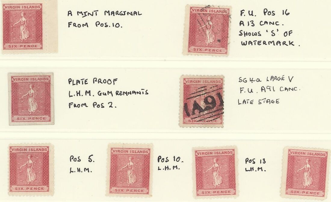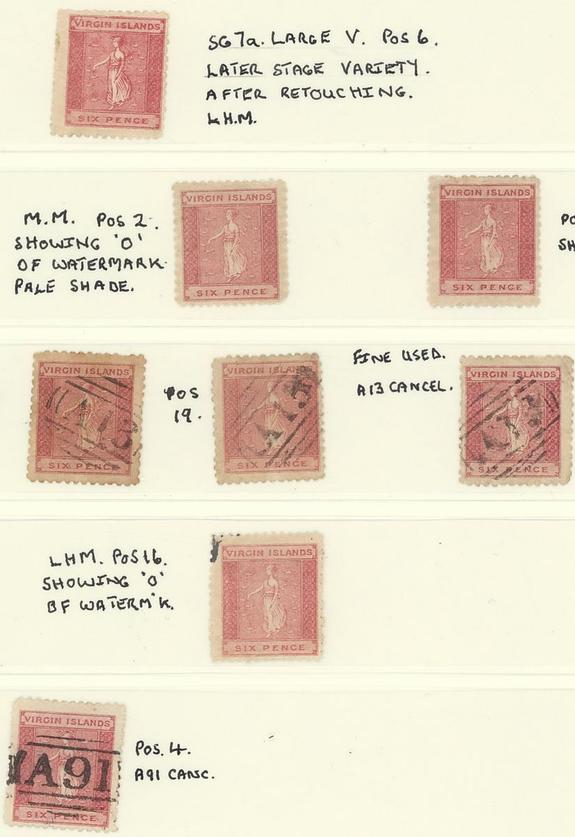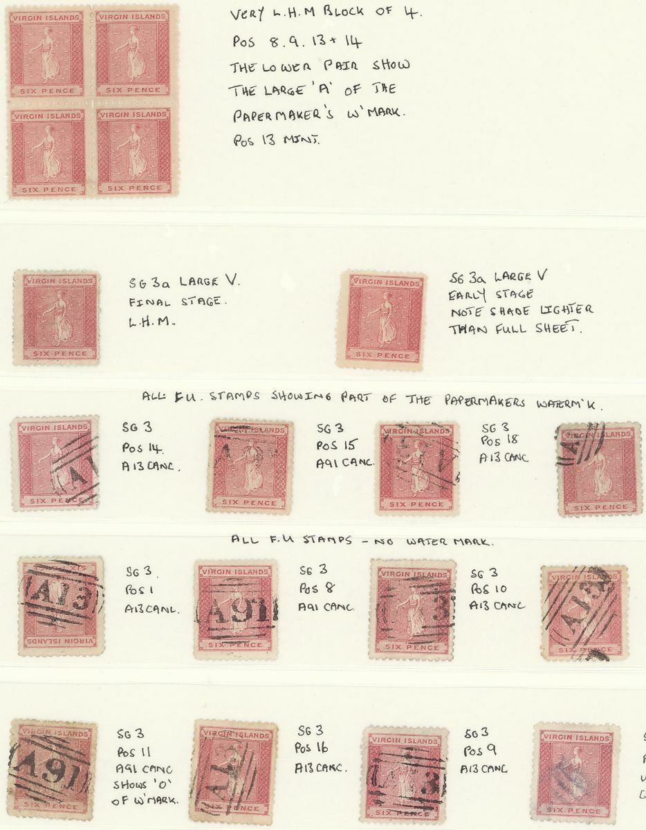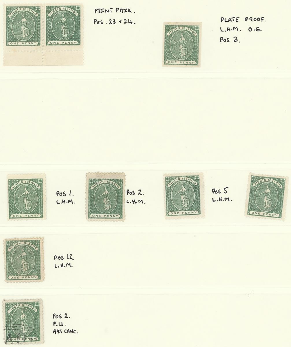 1858-66, a mint and used collection on Linder pages including 1858-60 G.B. 6d. used in Virgin Islands (faults), 1866 white wove paper 1d. used (6), 1d. deep green plate proof [Pos. 3], mint marginal pair [Pos. 23+24], mint singles (5) and single [Pos. 2] fine used, 6d. rose mint block of four [Pos.8-9, 13-14], and two singles, both with large "