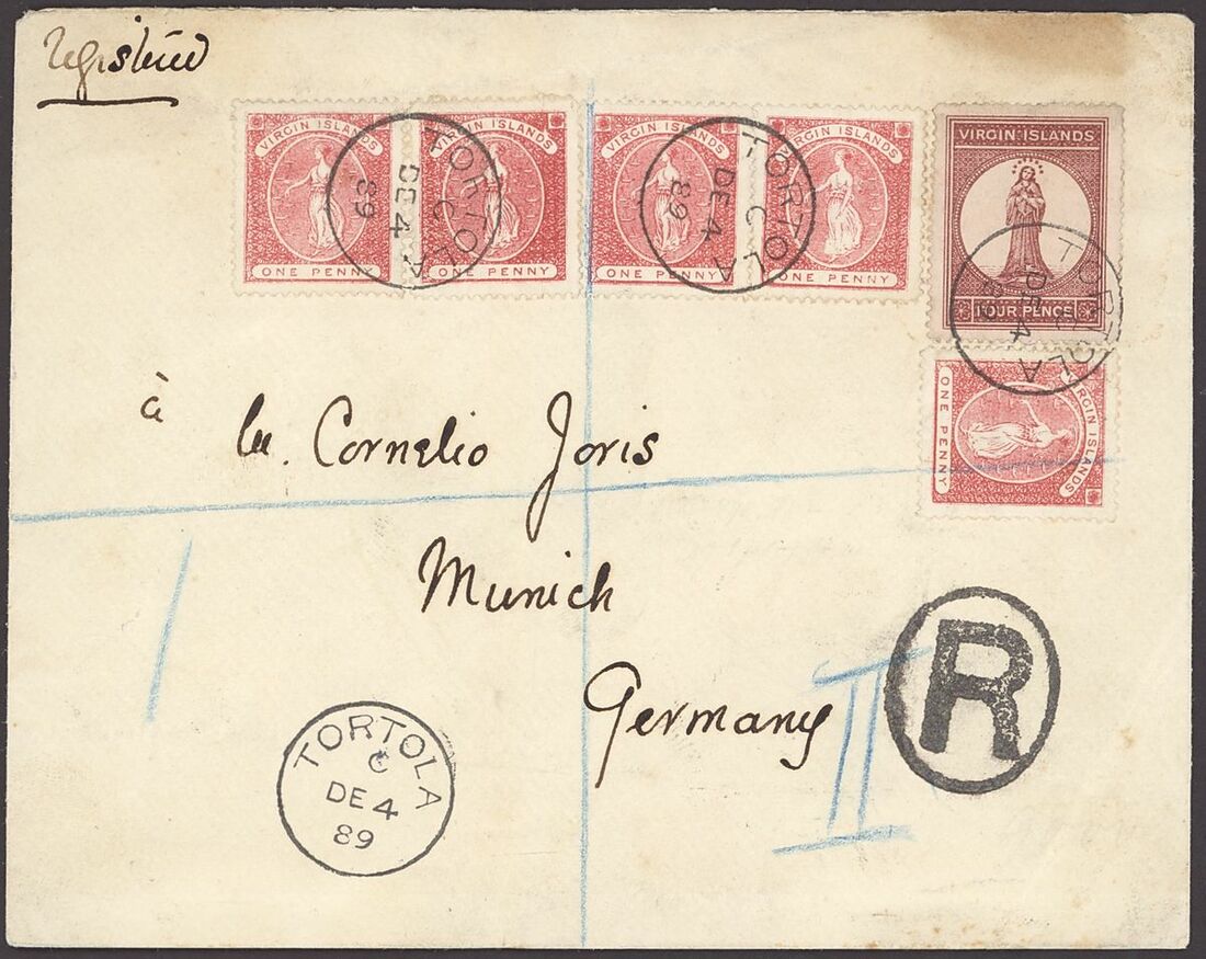 1889 (4 Dec.) envelope registered to Germany bearing 1887-89 1d. (5) alongside 1867-70 4d. lake-red on pale rose paper all tied by Tortola d.s. with "R" in oval and a further strike of the despatch c.d.s. with arrival datestamp on reverse; the envelope with stain at top though a scarce mixed-issue franking and highly appealing