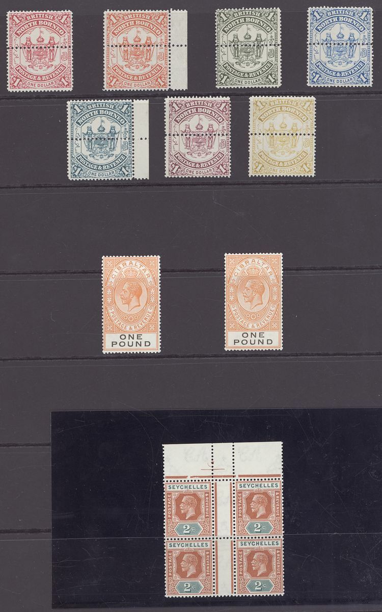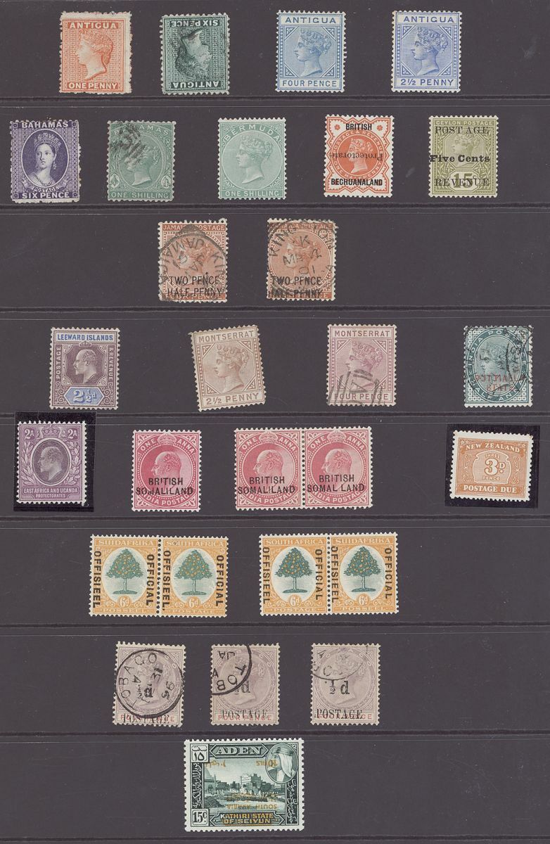 Empire selection (41), including Antigua 1876 6d. watermark inverted, Bahamas 1863 6d. watermark reversed, 1863-80 perf. 12½ 1/-, Bechuanaland 1889 ½d. with "Protectorate" inverted, Bermuda 1865-1903 perf. 14 1/-, Ceylon, Gibraltar 1926 £1 (2), Jamaica, Kenya 1903 2a. inverted watermark, Montserrat 1884-85 4d. mauve "Top left triangle detached", Seychelles, Somaliland, etc., unused and used. An interesting lot. Cat. in excess of £3,600