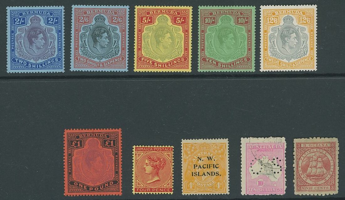 Mint and used selection arranged on eight stockcards including Bermuda 1938-53 2/- to £1 mint, Australia Official 1915-28 10/- CTO with gum, New Zealand Chalon Head 2d Hausberg's imperf proof in black on white card block of eight, British Guiana selection, with values up to 48c., mixed condition, viewing advised