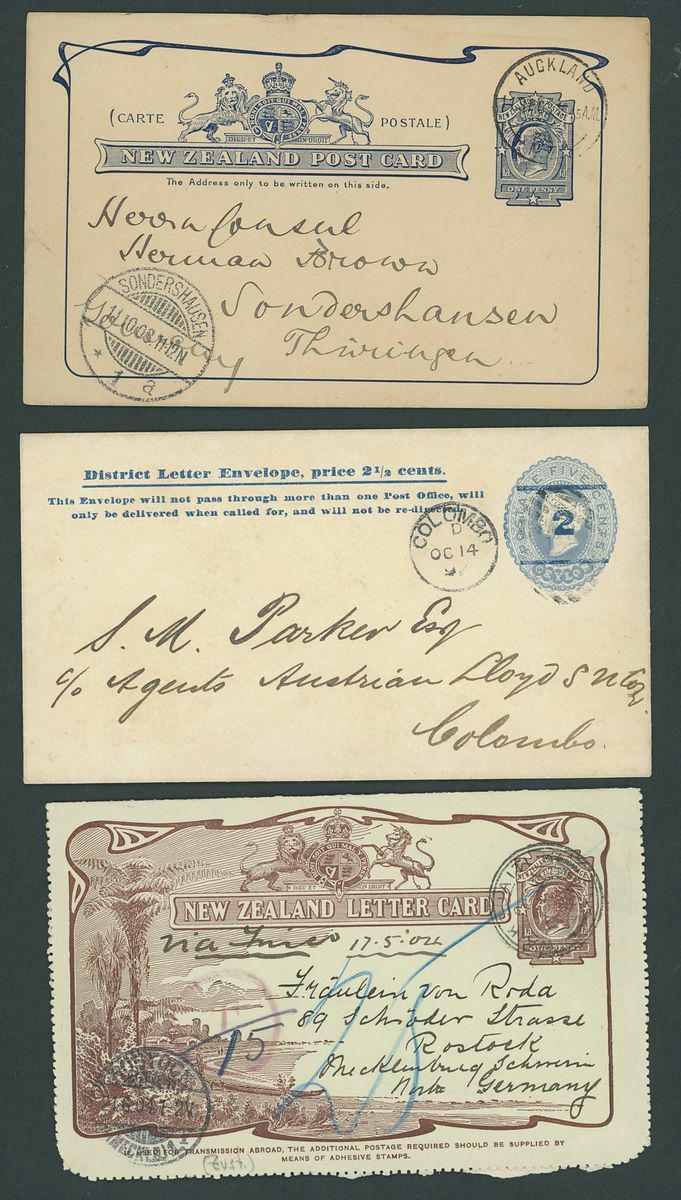 1897-1904 used postal stationery trio comprising Ceylon 1897 2c. on 5c. district letter envelope; New Zealand 1903 1d postal stationery card to Germany, 1904 1d brown on pale green postal stationery