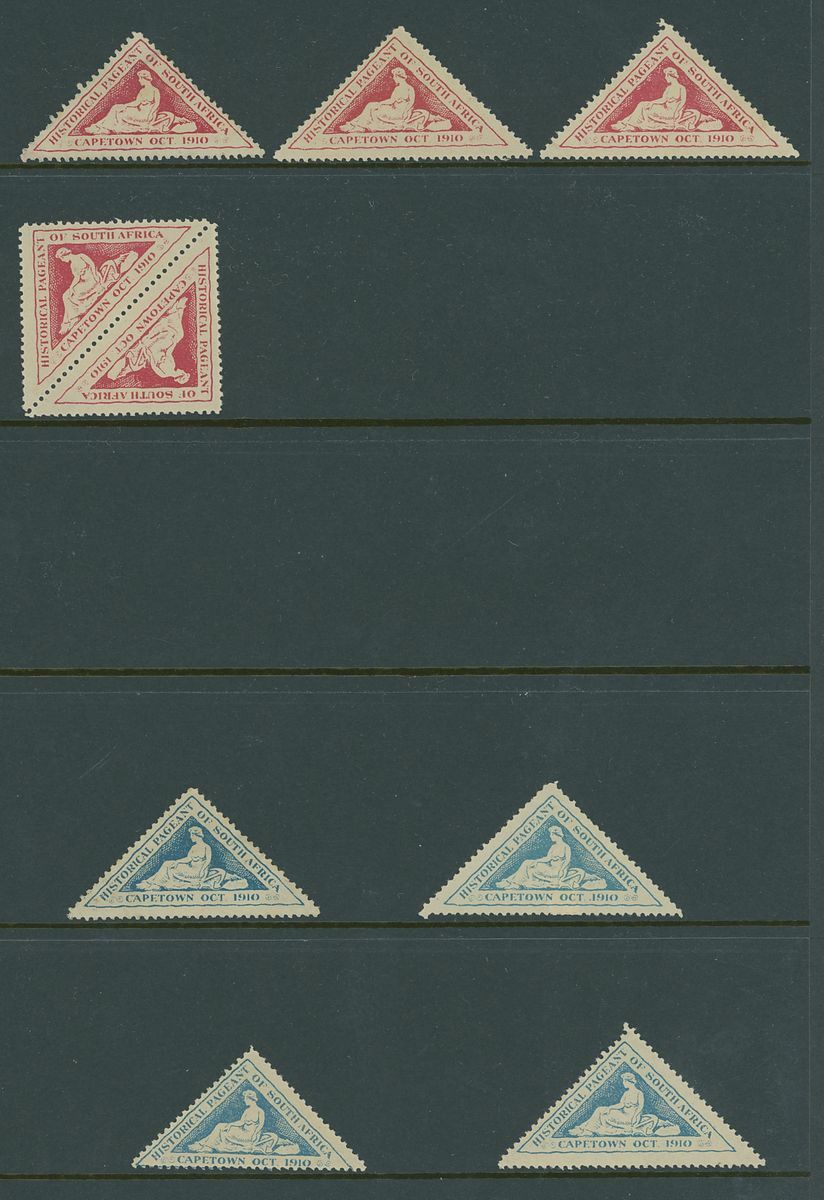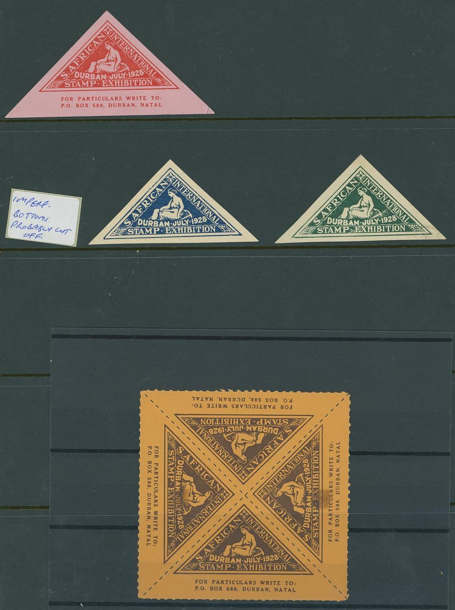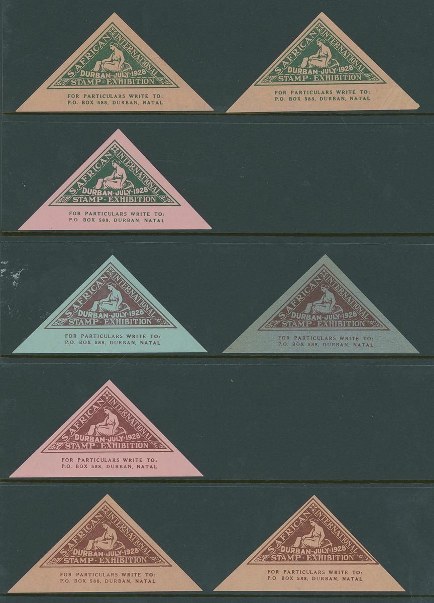 Triangular shaped label selection including 1910 Historical Pageant of South Africa (21) unused, 1912 Margate philatelic congress (16) one on ½d. postal card, one on piece the other unused, 1928 Durban stamp Exhibition (34) unused.  A most unusual lot.