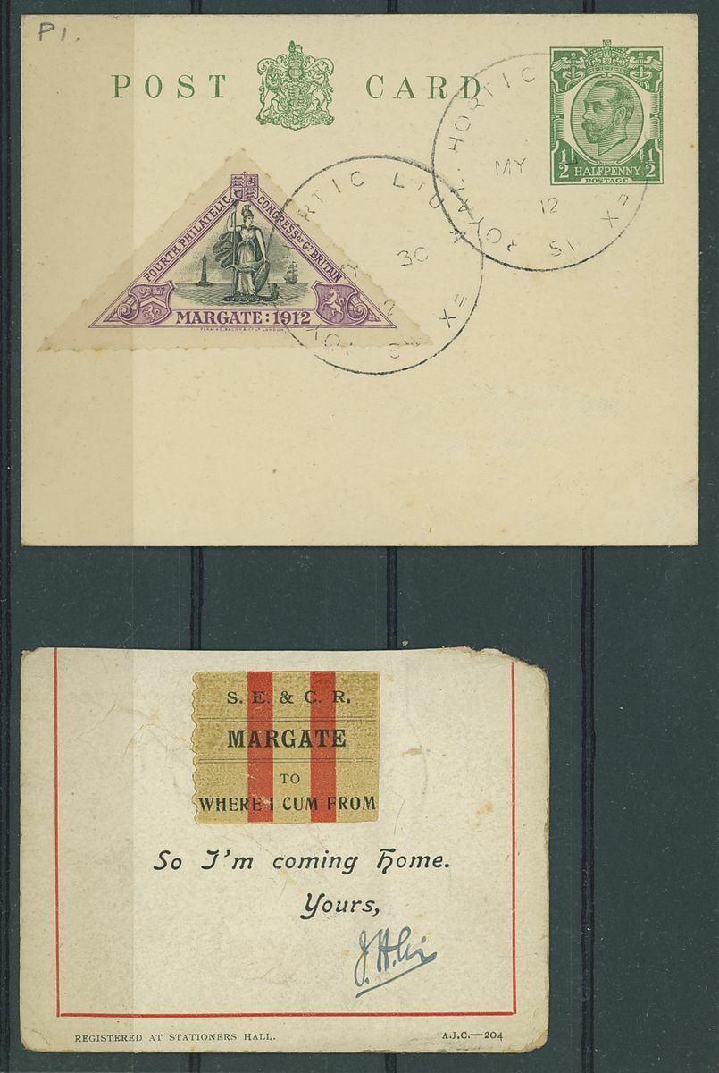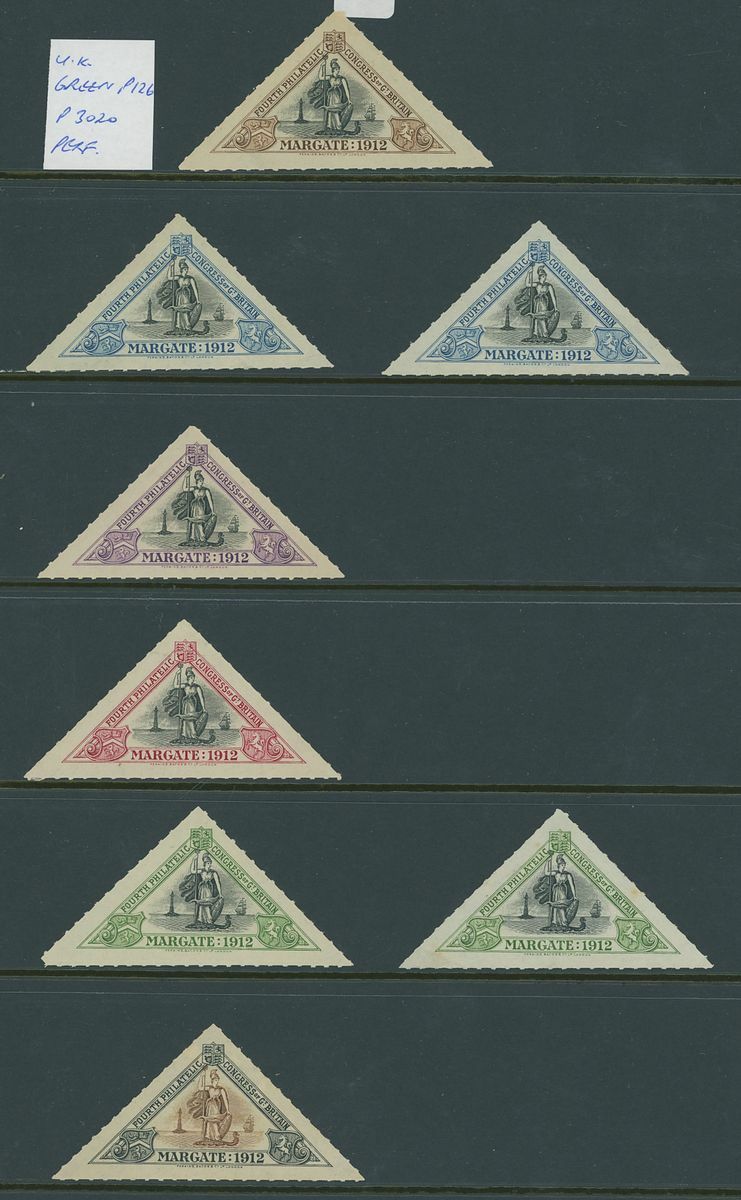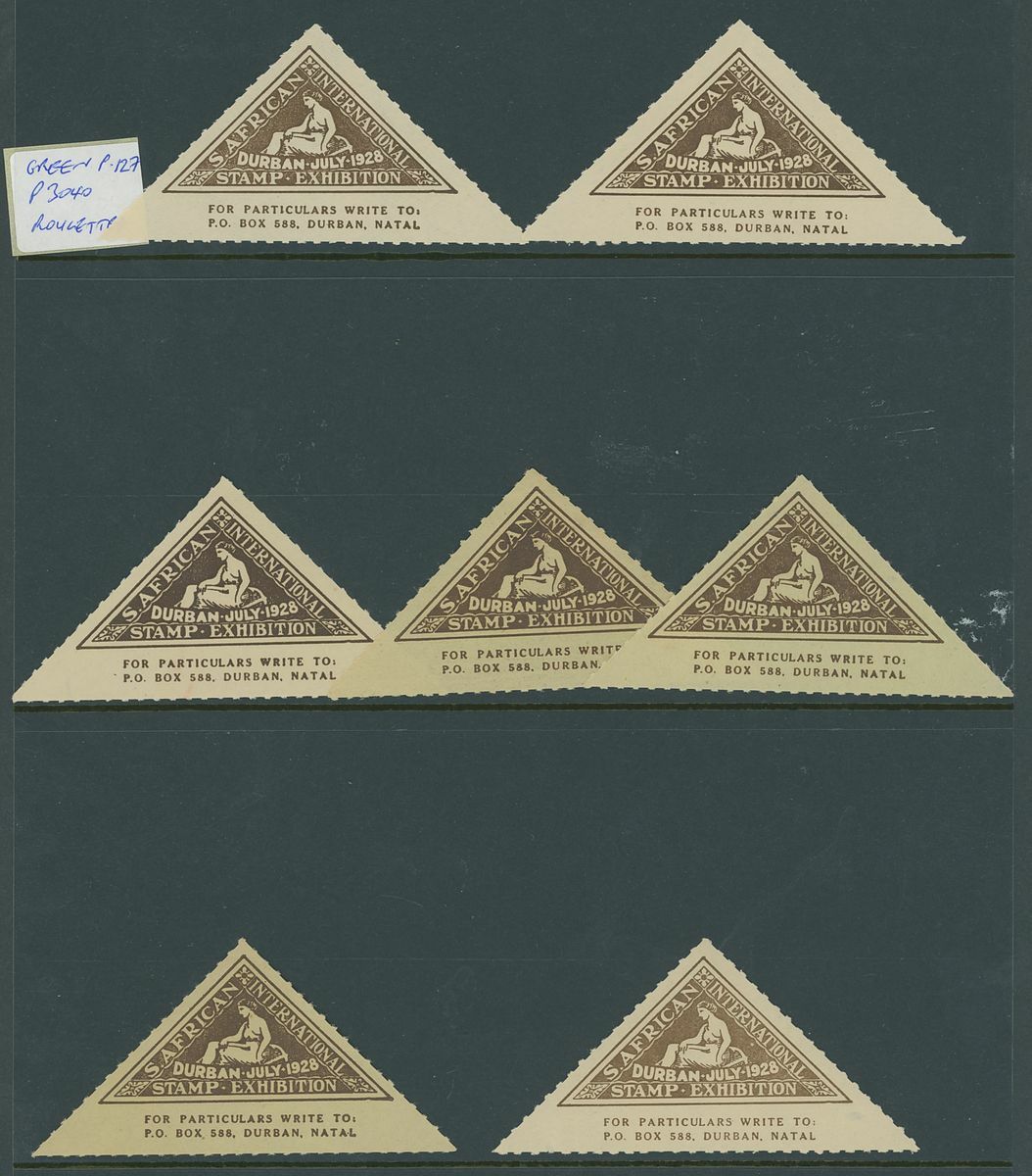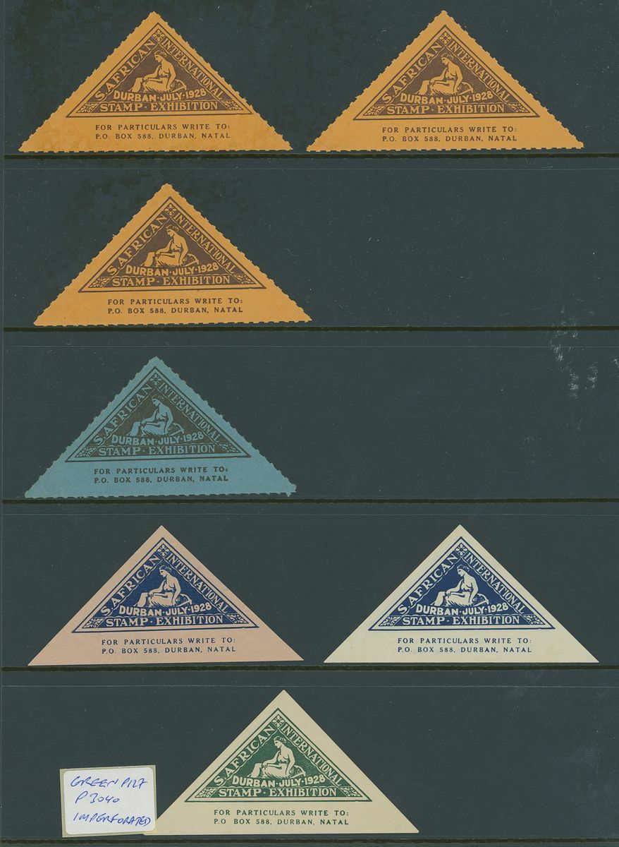 Triangular shaped label selection including 1910 Historical Pageant of South Africa (21) unused, 1912 Margate philatelic congress (16) one on ½d. postal card, one on piece the other unused, 1928 Durban stamp Exhibition (34) unused.  A most unusual lot.