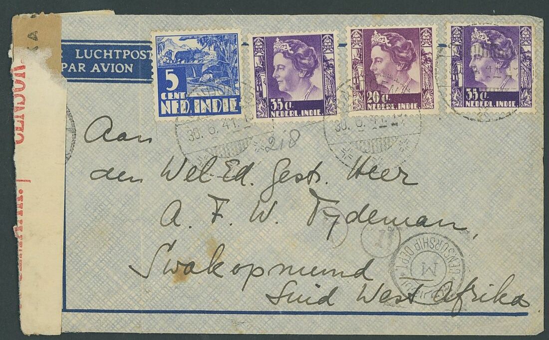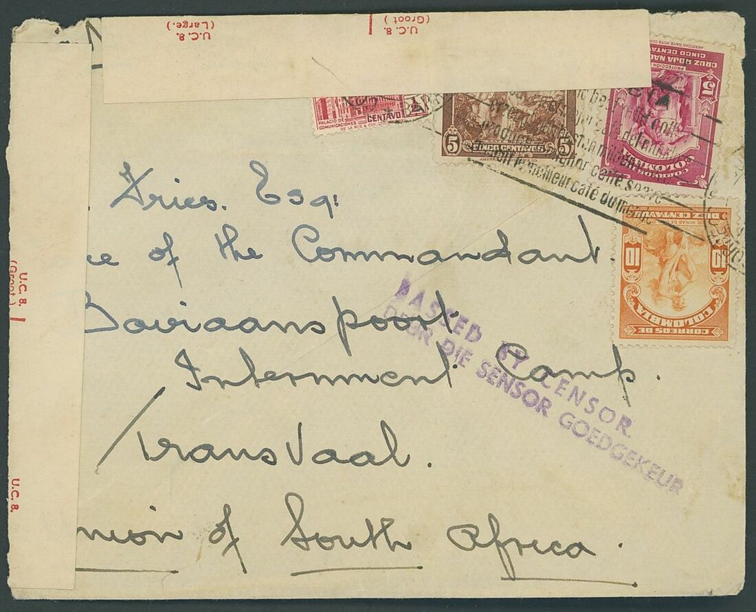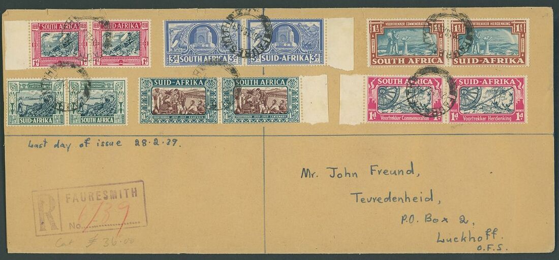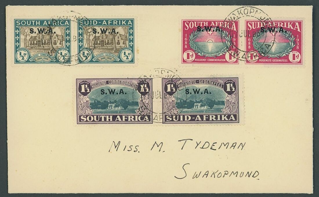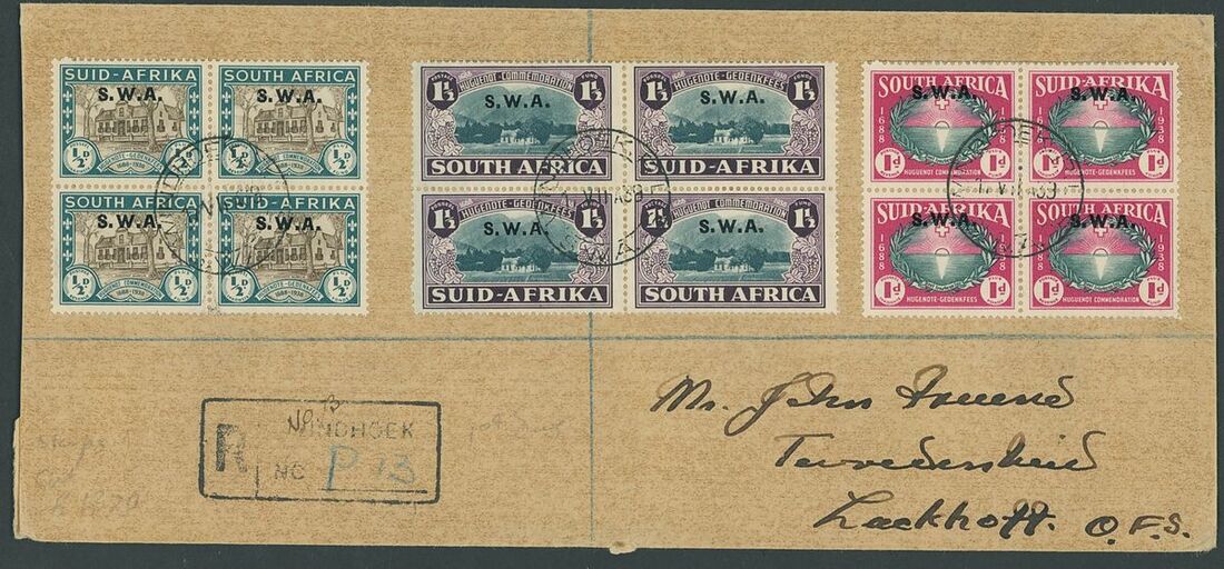 Postal history selection including South West Africa 1939 250th Anniversary set in blocks of four on envelope registered to Orange Free State, additional envelope with set in pairs; South Africa 1939 envelope registered to Orange Free State marked