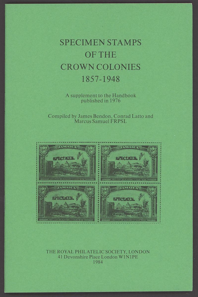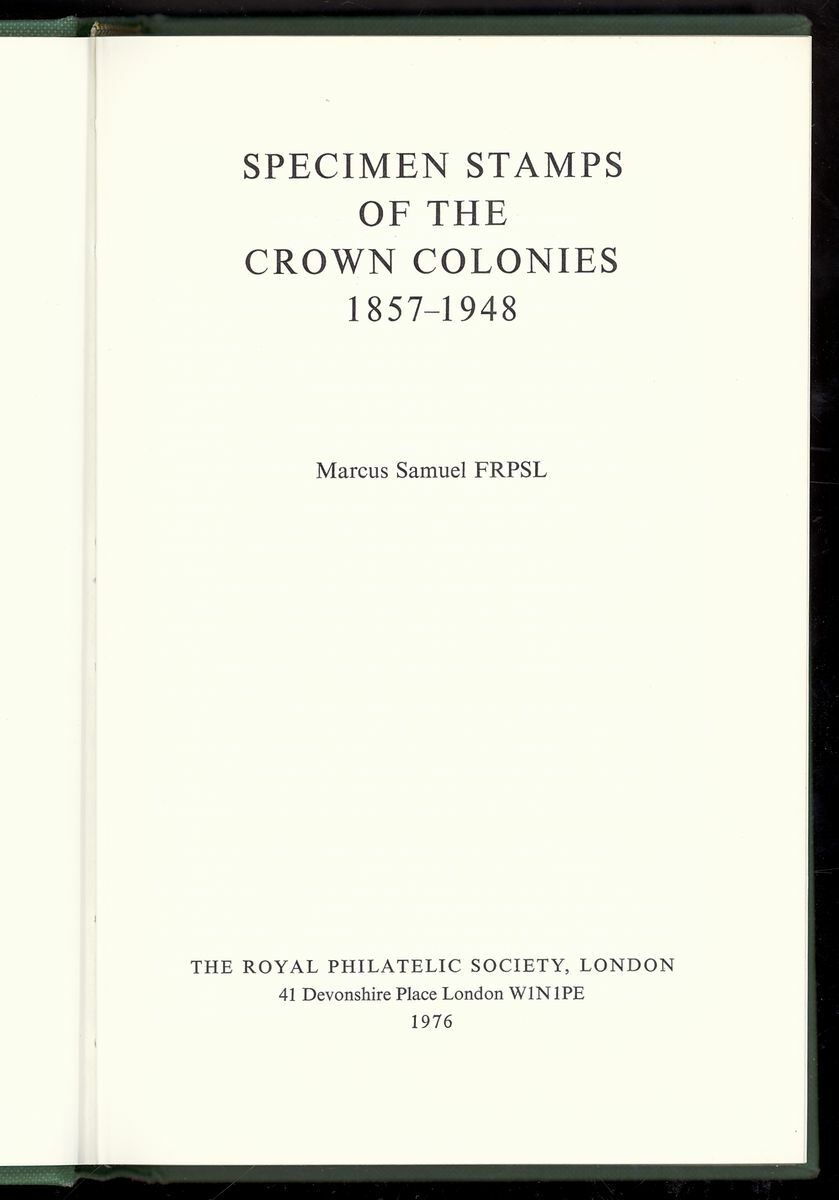 "Specimen Stamps of the Crown Colonies, 1857-1948", Marcus Samuel with additional supplement. Fine and scarce.