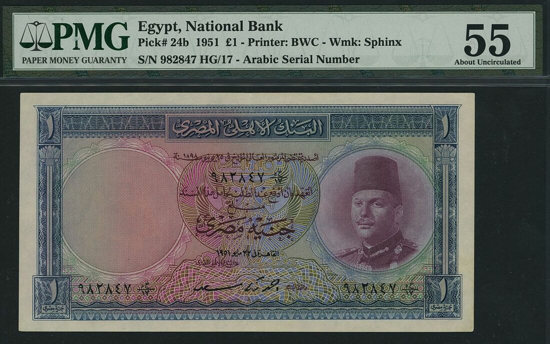 (x) National Bank of Egypt, £1, 1951, serial number 982847 HG/17, (Pick 24b, BNB 123), in PMG holder 55 About Uncirculated