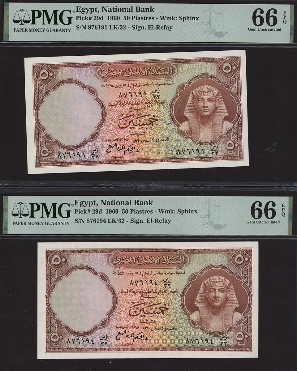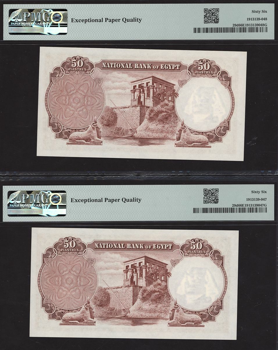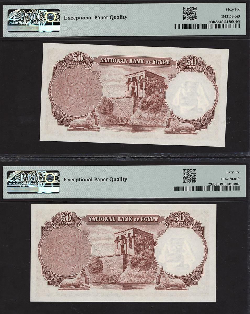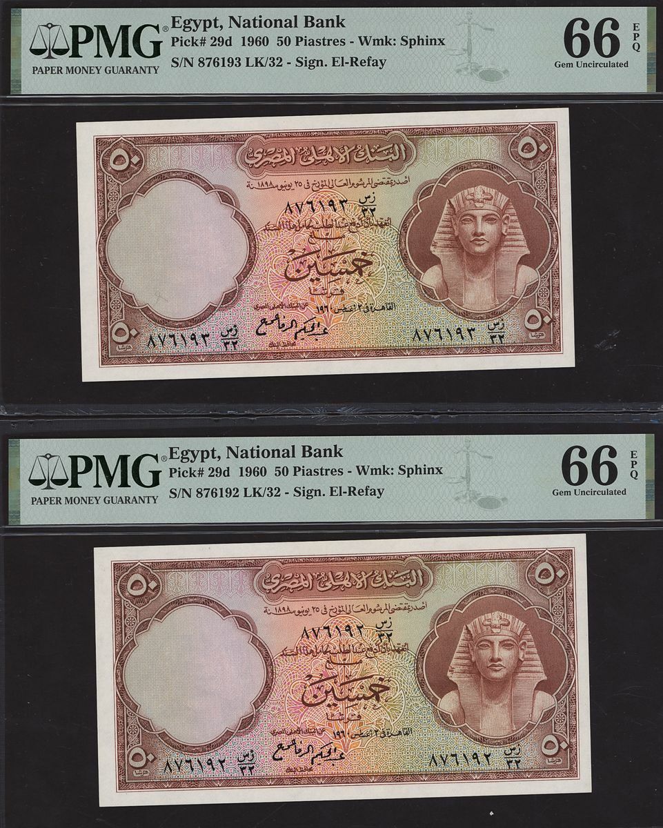 (x) National Bank of Egypt, Consecutive group of 50 Piastres, (1960), serial numbers 876191-4 LK/32, (Pick 29d, BNB 129), in PMG holder 66 EPQ Gem Uncirculated